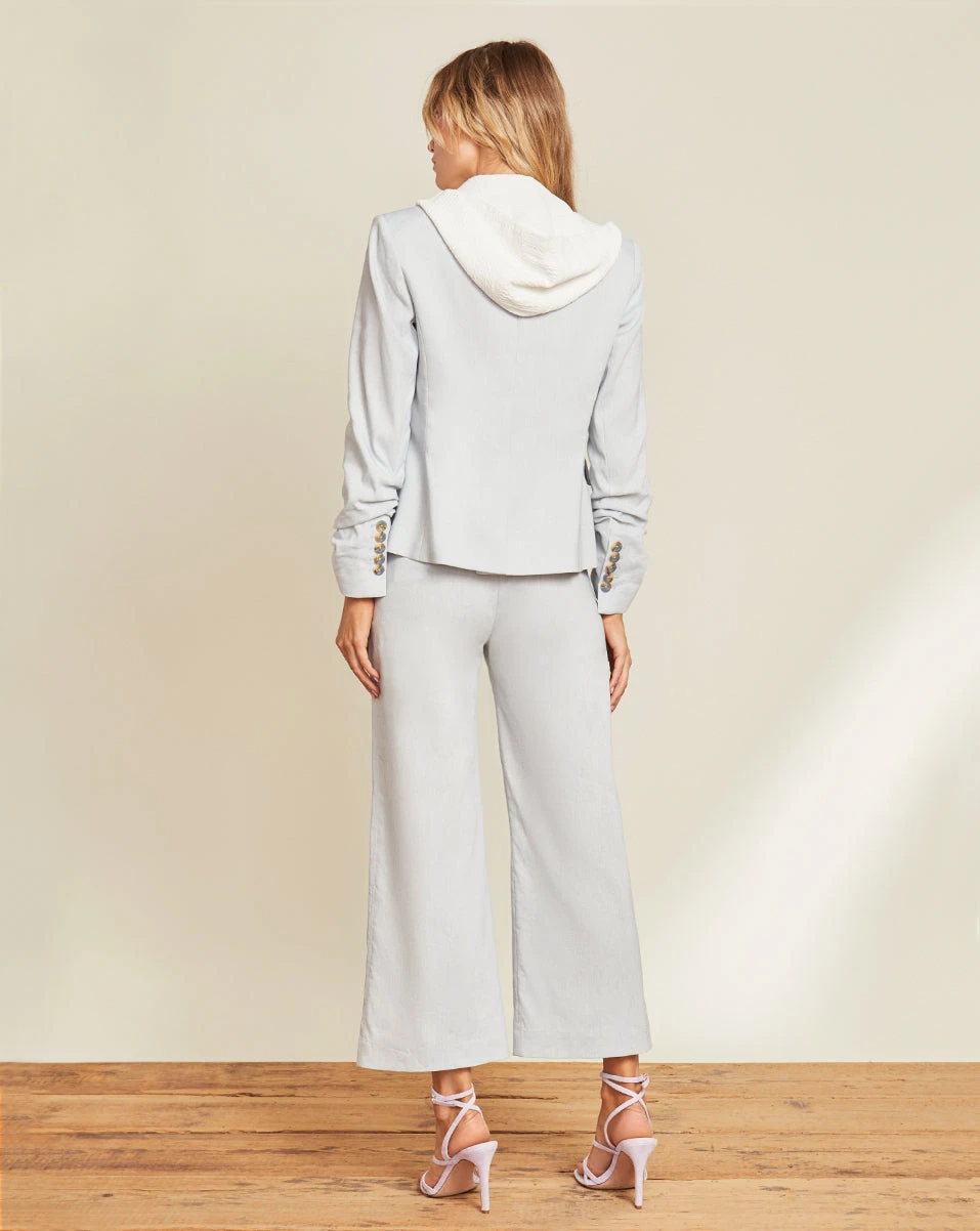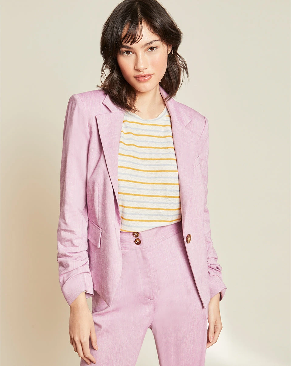 In our stretch-linen tailoring, the Aaliyah jacket is a must-have for any wardrobe, thanks to its versatile look and design. The single-breasted style features gathered sleeves and a decorative button for a chic, on-trend look. Pair with its coordinating shorts for a suiting moment, or throw it over your shoulders while wearing your favorite dress.