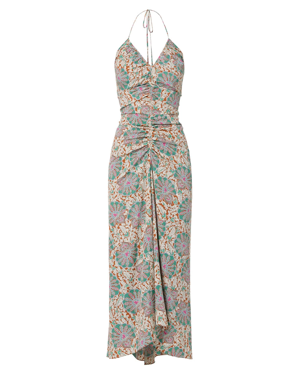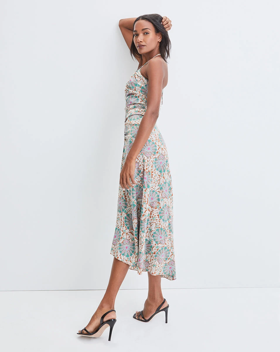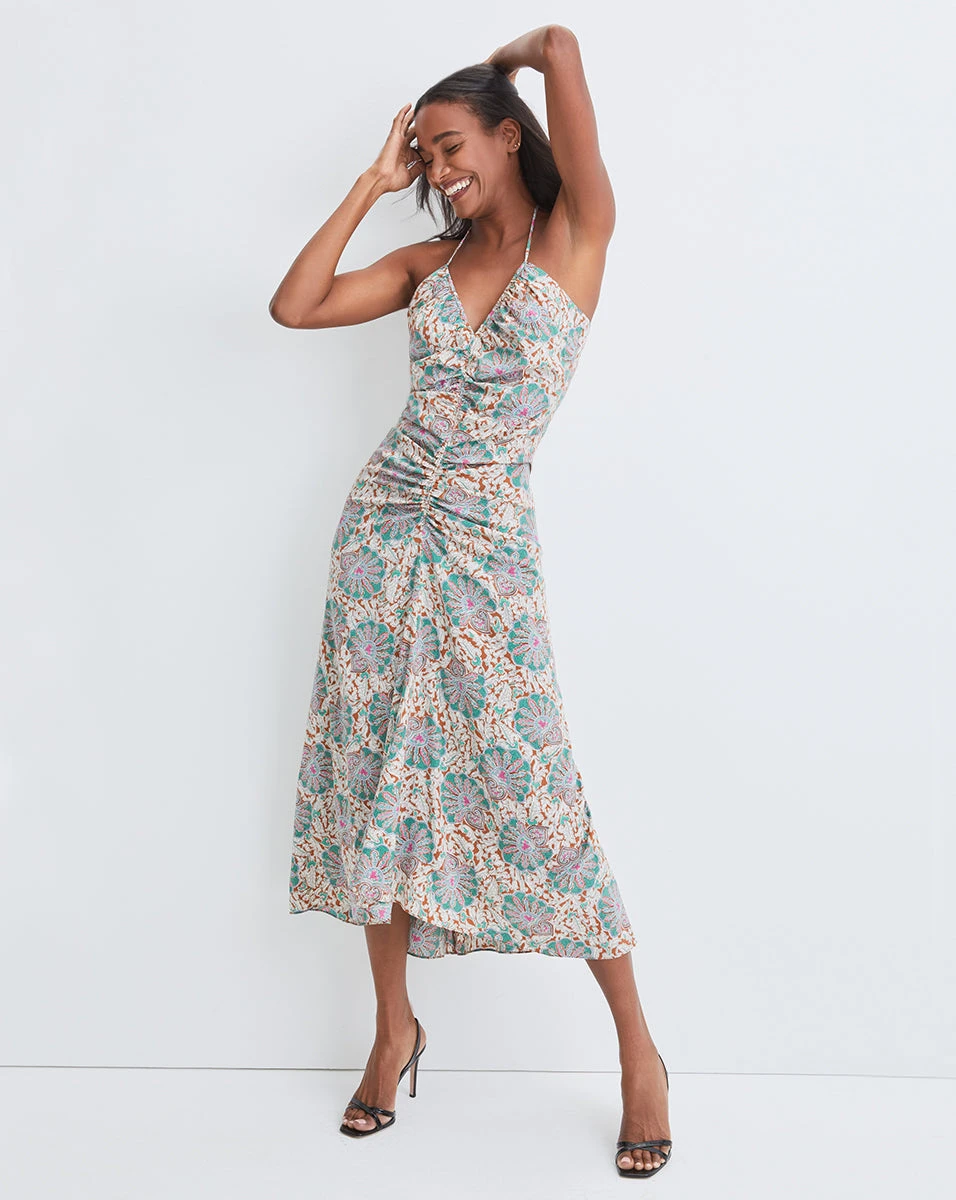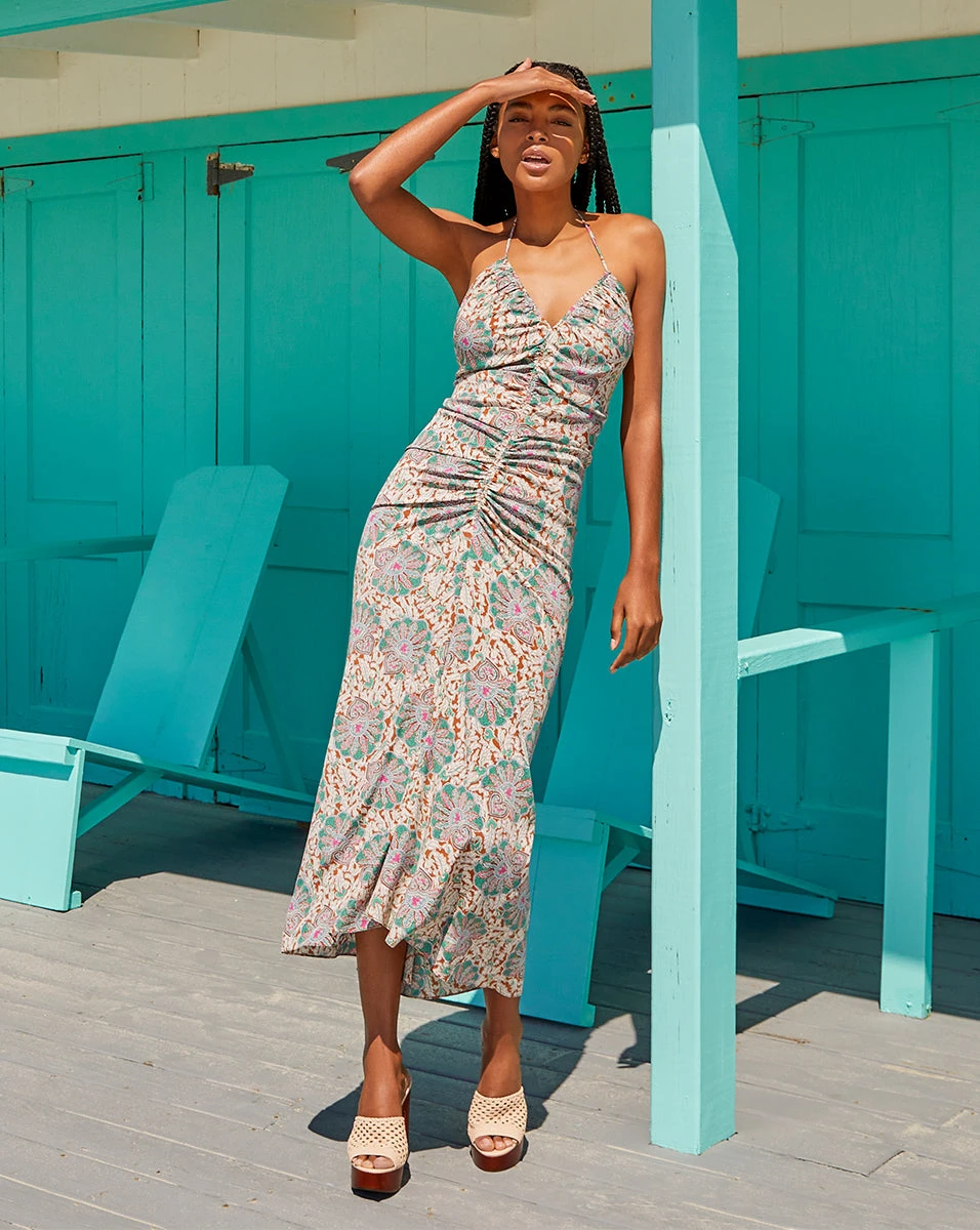 In our medallion-floral print, the Aldana dress is your answer to easy summer dressing. Halter straps and center ruching complete the look of this figure-flattering style. Wear with simple stiletto sandals and let the print do the talking.