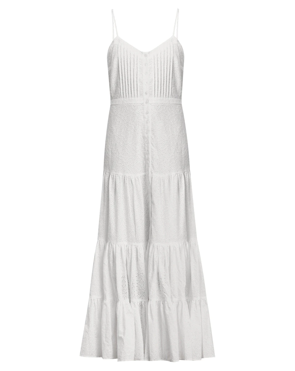 Our glamorous yet relaxed Alondra dress features a tiered maxi silhouette and delicate eyelet embroidery. The 100% cotton style also features pintucked pleating at the bodice, giving you a flattering look, every time. Wear with polished gold jewelry and slide sandals all weekend long.