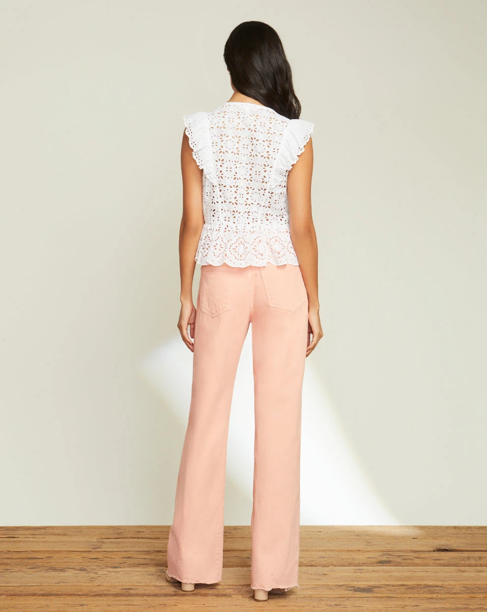 Ruffled trims and allover eyelet embroidery define our Araya top. Front-button closures complete the look of this feminine style. Wear with straight-leg jeans and platform sandals for a classic uptown look.