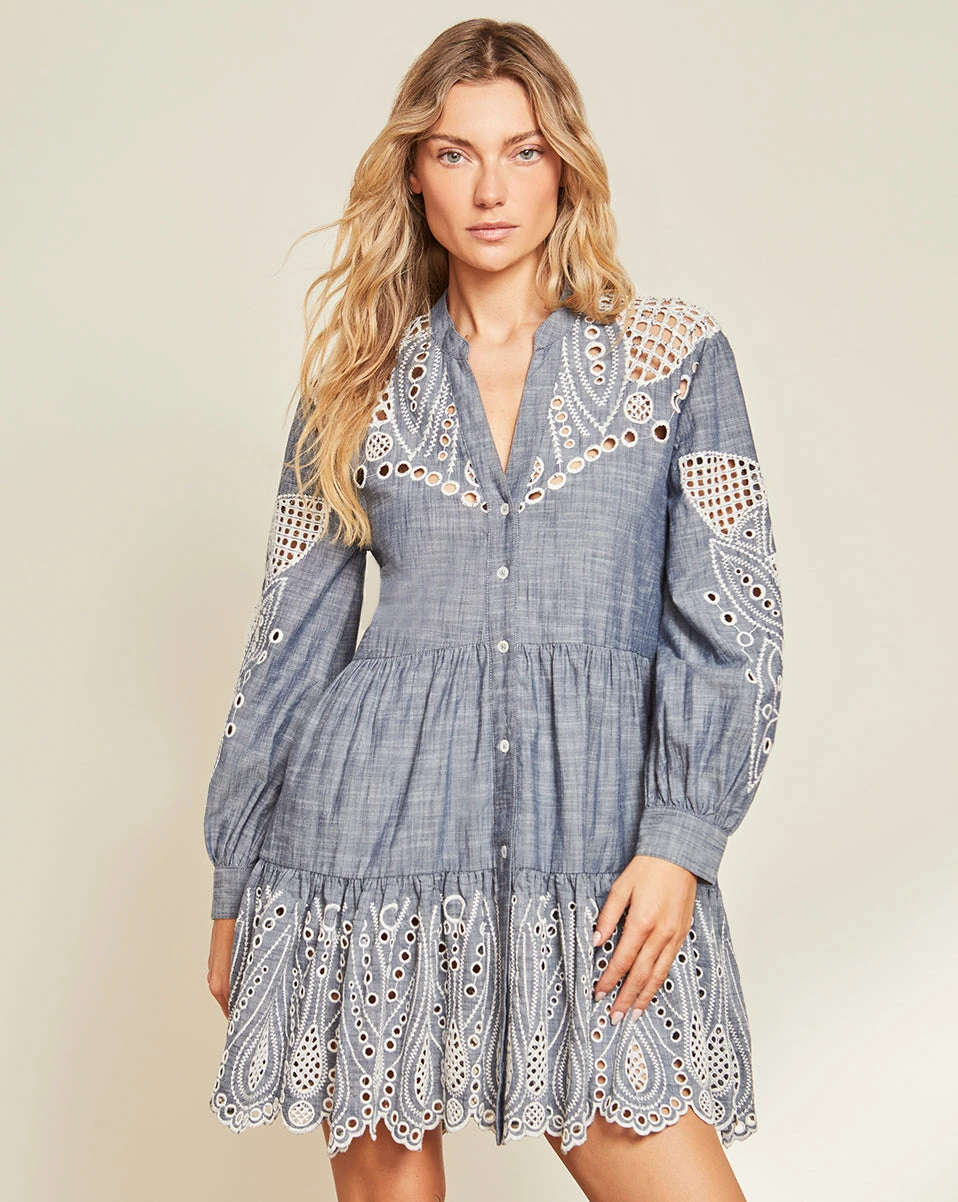 Our chambray Ariana dress features delicate eyelet embroidery and a tiered silhouette. A feminine take on the denim button-down dress, this effortless style takes you from week to weekend and back again. Wear with sneakers for a casual look or dress it up with strappy heels and polished gold jewelry.