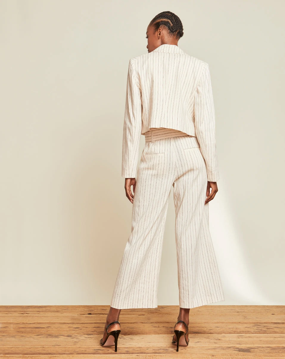 Our cropped Armada jacket features classic pinstripes and a streamlined design. The single-breasted style works well with everything from jeans to skirts, but we especially love pairing it with its coordinating pants.
