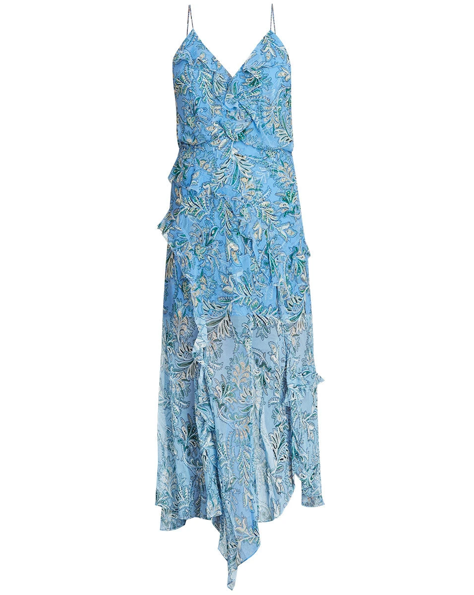 In our Jacobean floral print, the Avenel is a slip-dress-style that features front ruffles and a thigh-high side slit. An asymmetrical hem finishes the look of this glamorous piece. Pair with stiletto heels for your next event.