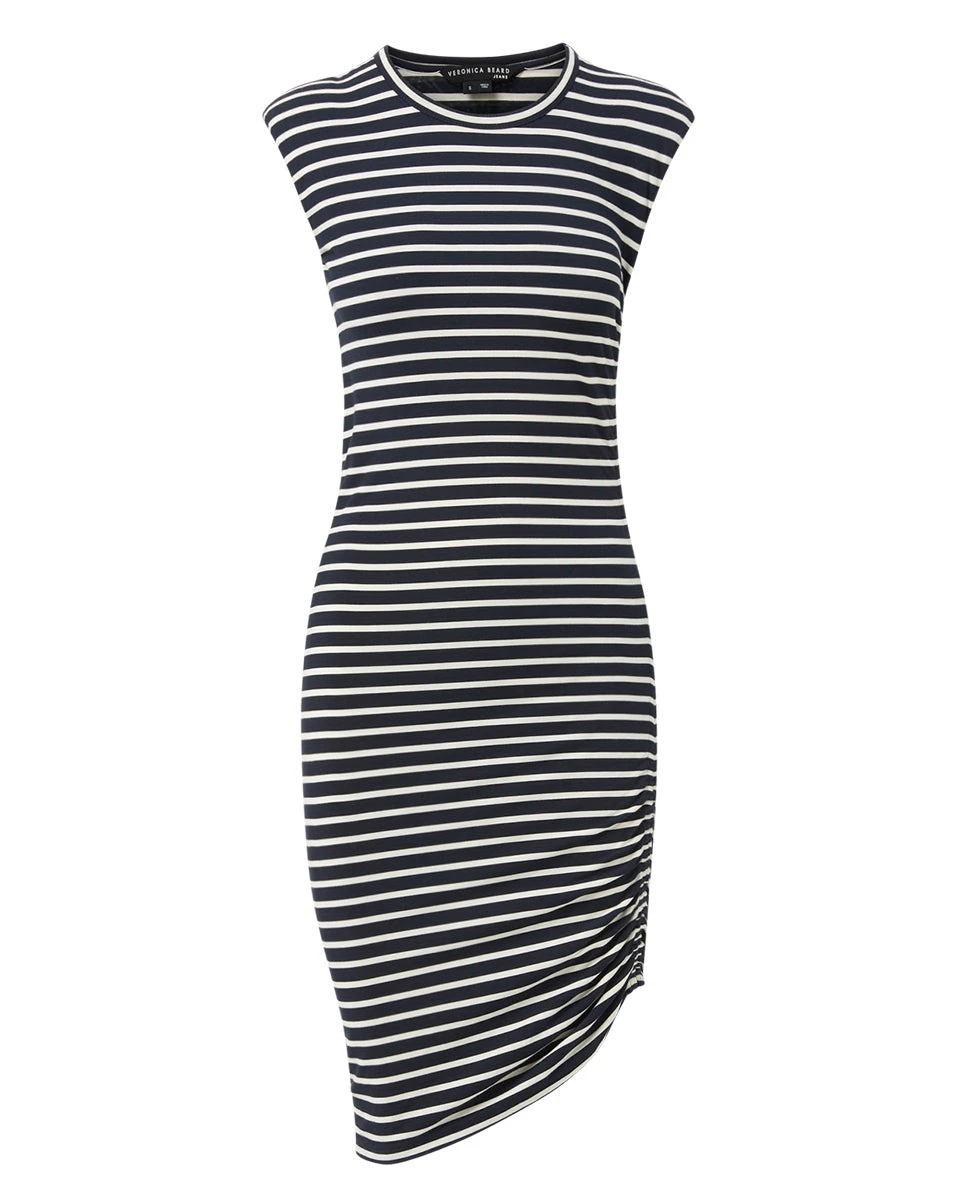 Padded shoulders and allover striping give our casual Brompton dress an elevated look. Ruching at the side provides a figure-flattering finish. Wear with sandals now; add a jacket and booties in the fall.