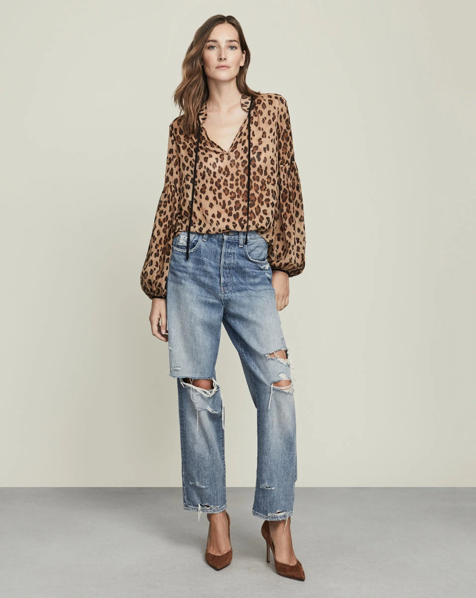 If you’re looking for the perfect leopard top, the Charen is it. With a split V-neck, puffed sleeves, and relaxed fit, this relaxed silk piece is an easy way to elevate the everyday. Pair it back to skinny jeans and stilettos for a night out, or tuck it into high-rise pants and finish with sneakers for daytime cool.