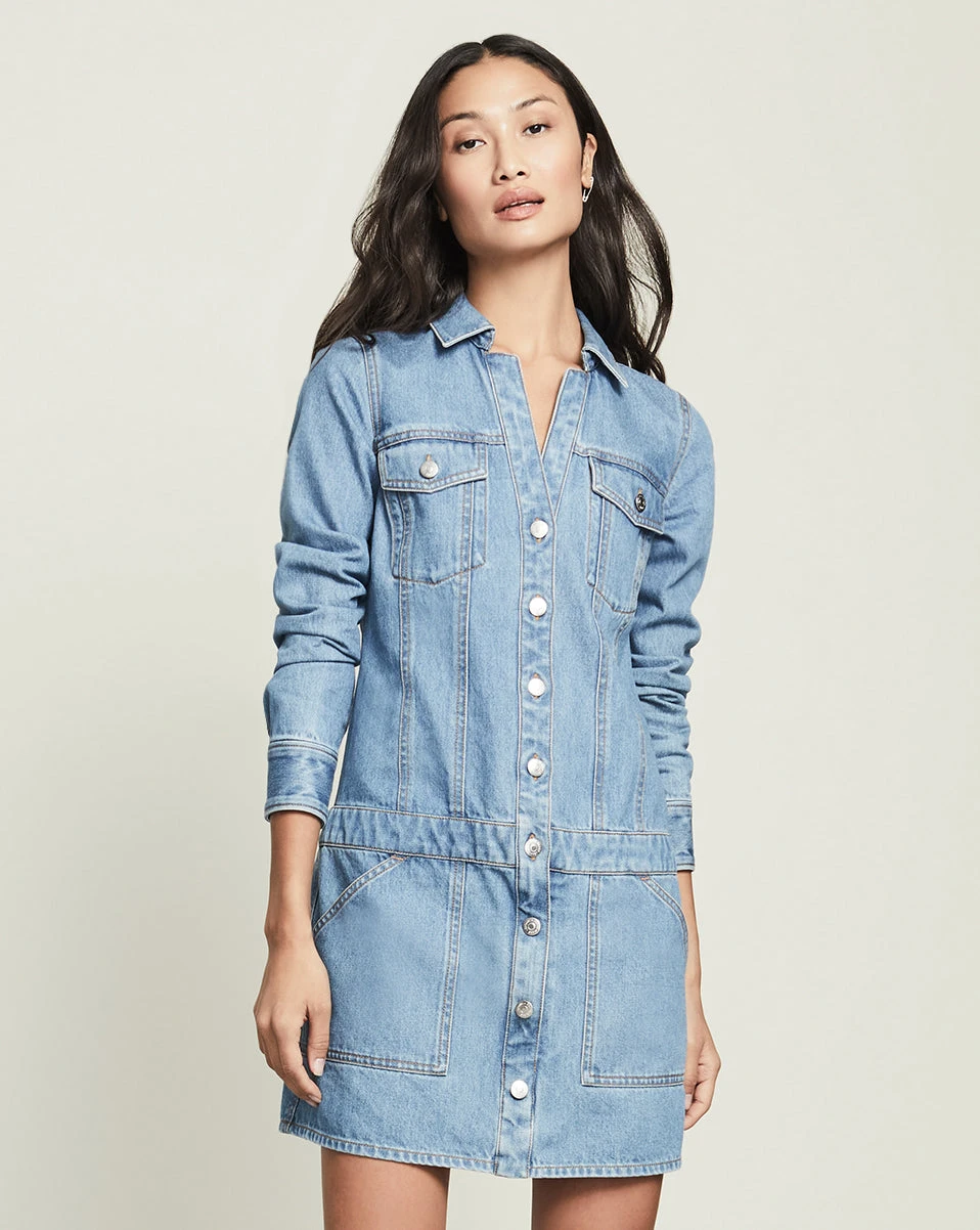 Our Cicely denim dress features a drop-waist silhouette along with front-button closures and oversized patch pockets. This casual-cool style works well with everything from sneakers to heels, making it the perfect day-to-night piece.