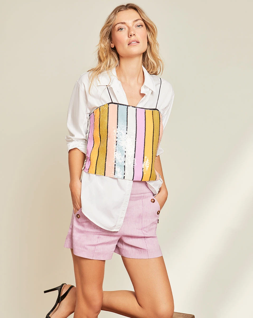 Going-out tops are back and the Harmoni is the way to do it. A relaxed and cropped silhouette combined with rows of candy-colored sequins define the look of this must-have style. Wear with high-rise pants and sky-high heels for a statement finish.