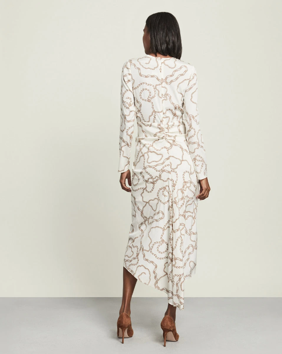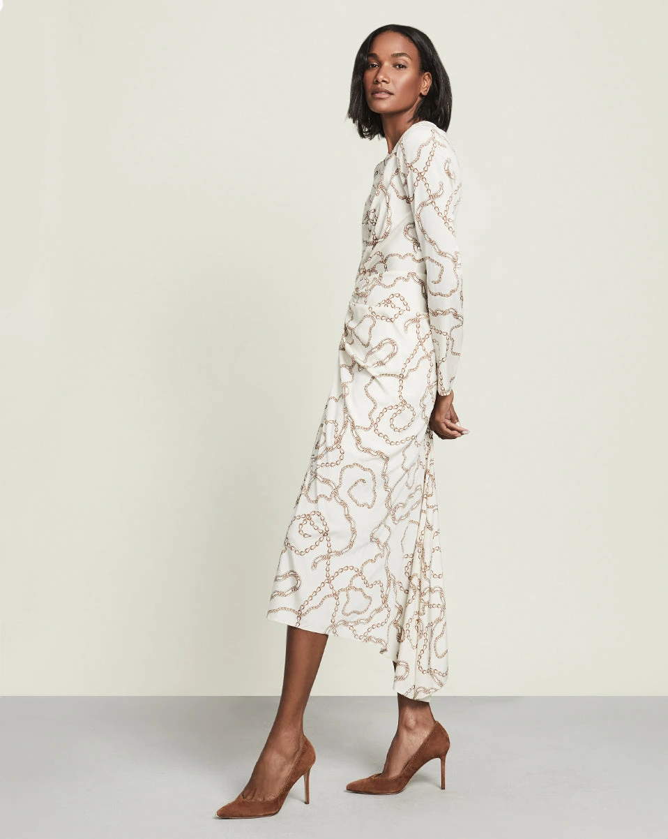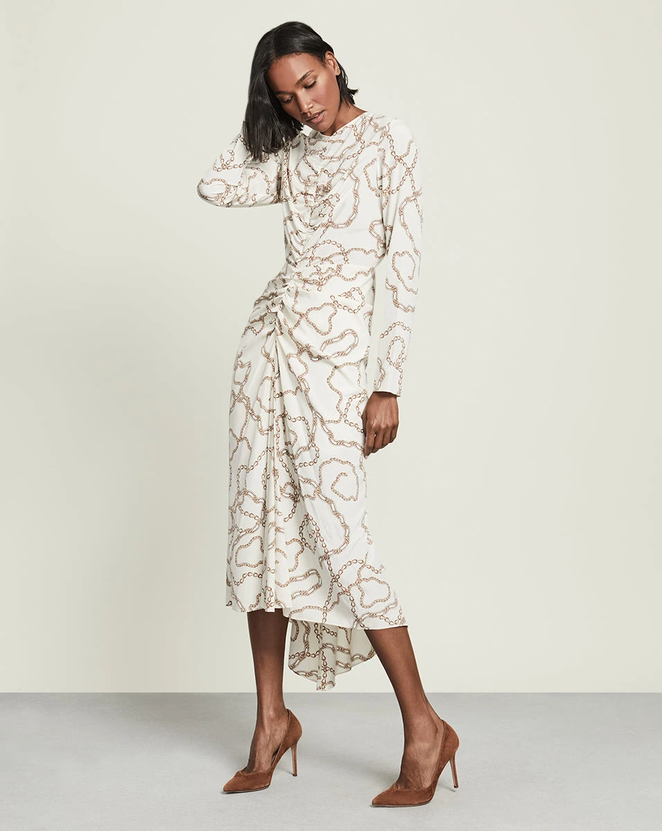 In our chain print, the Kersey dress is a glamorous choice for your next night out. This stretch-silk style cuts a flattering figure thanks to its center ruching and asymmetrical hem. Wear with barely-there sandals and polished gold jewelry for a memorable look.