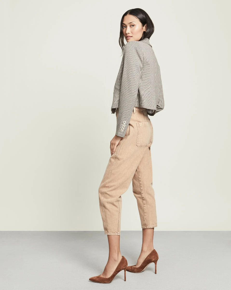 In our mini-check tailoring, our Nevis jacket is an updated classic that you’ll reach for time and time again. A cropped, double-breasted silhouette adds a fashion-forward look, while the neutral palette allows for versatility. Wear with its coordinating pants, or dress it down with a pair of relaxed jeans.
