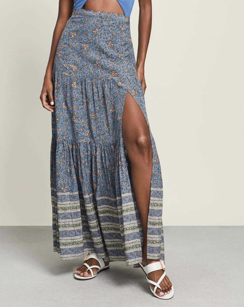 Our Serence maxi skirt showcases a tiered silhouette, high slit, and a micro-floral print, making it a statement piece both on and off the beach.