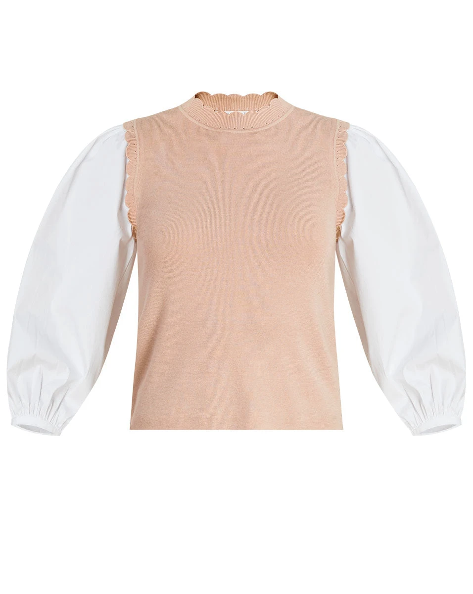 Effortless and always on-trend, the Steffi mixed-media top features a stretch merino wool shell and voluminous poplin sleeves. A scalloped trim finishes the look of this chic style. Wear with distressed jeans and sneakers for day; switch to heels at night.