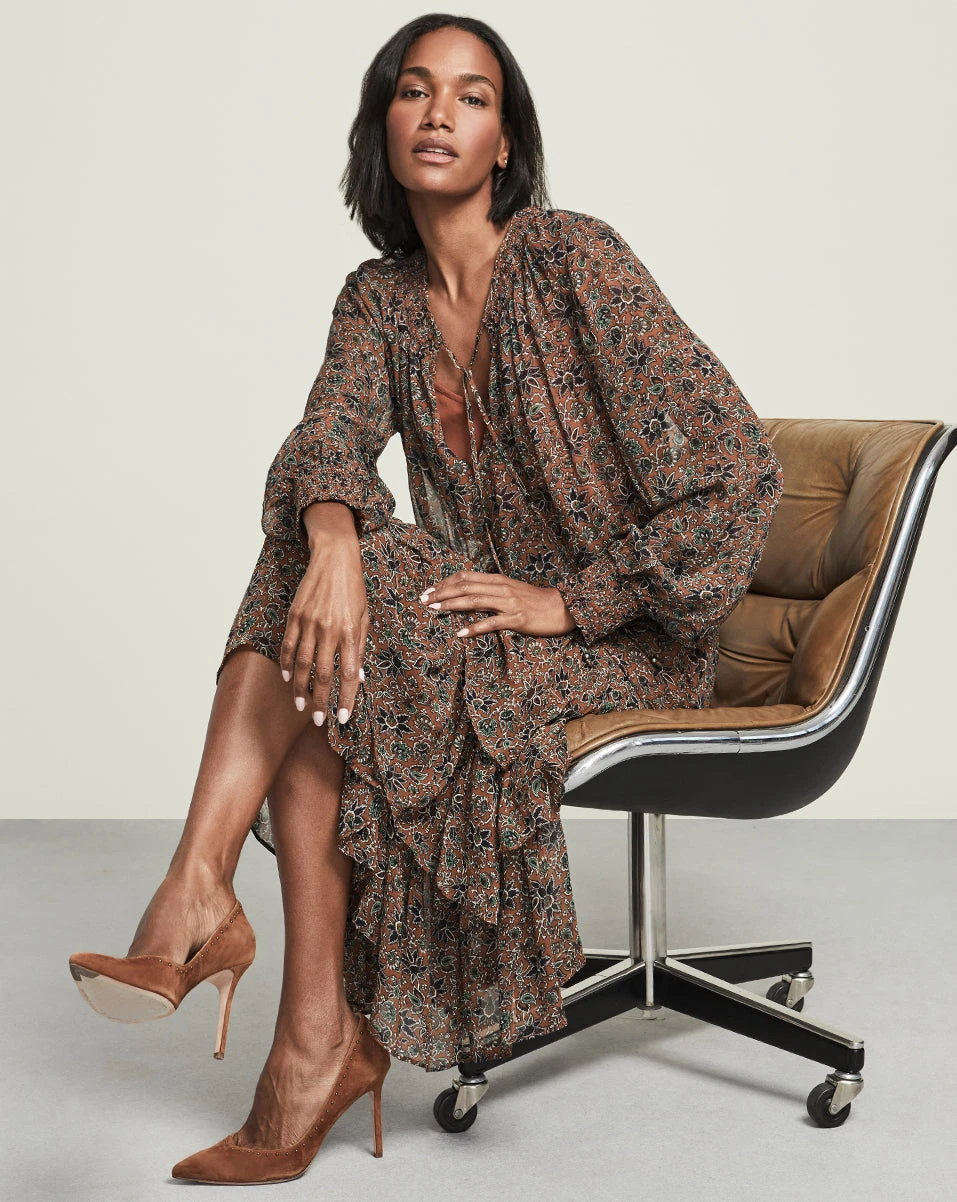 In our boho-floral print, the Tunis dress features a blouson-style top along with drop-waist tiered hem. Drawstrings at the neckline and smocked cuffs complete the look of this chic style. Pair with clog heels for an effortless date-night look.
