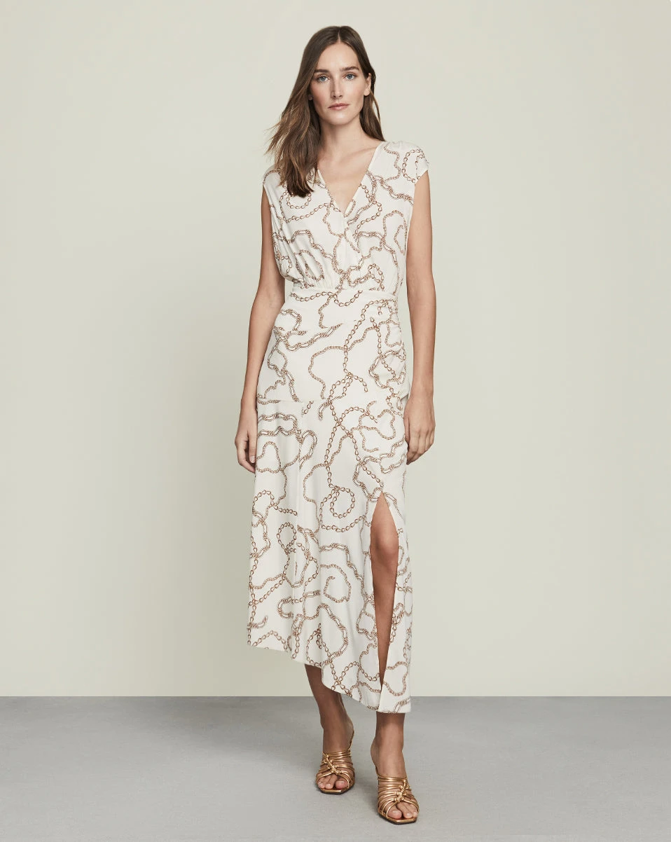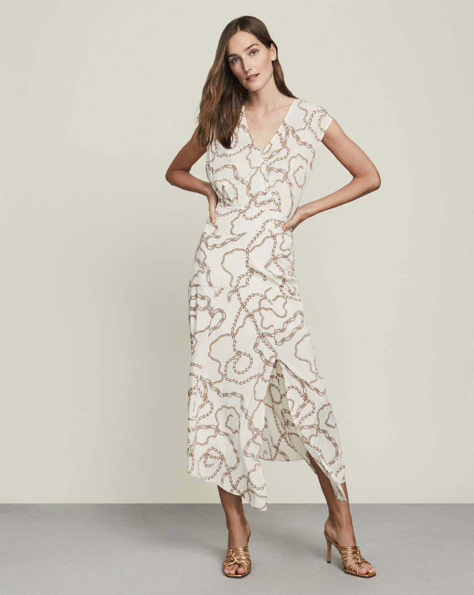 Our Wixson dress is a statement-maker, thanks to its chain print and thigh-high front slit. This stretch-silk piece also features an asymmetrical hem and slight ruching at the hips for a figure-flattering finish. Wear with stilettos and add polished gold jewelry for your next night out.