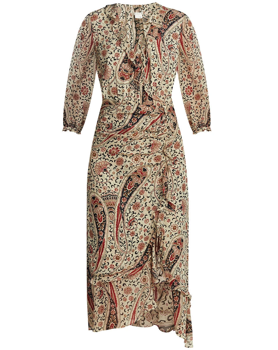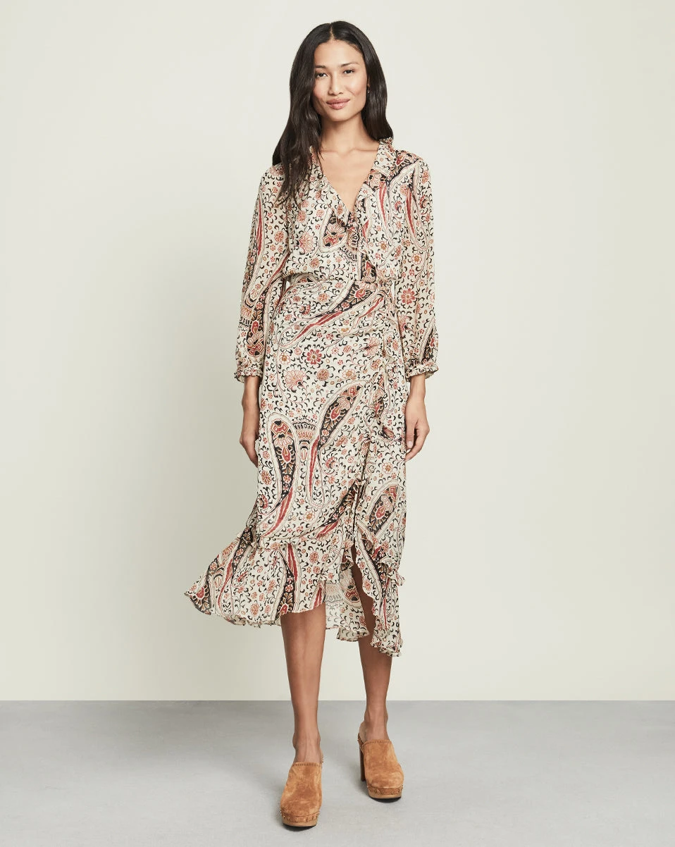 With an oversized paisley and floral print, the Derby dress makes a statement. Ruffles, ruching, and an asymmetrical hem finish the look of this silk style. Pair with clog heels and add a belt at the waist for your next girls’ night out.