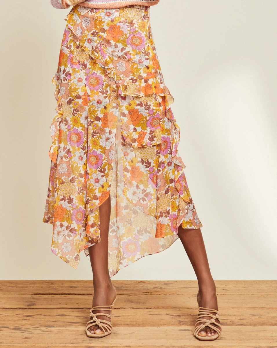In our garden-floral print, the Eleonora skirt features a midi length, asymmetrical hem, and ruffle detailing. A side slit completes this romantic style. Add downtown edge by styling with a leather jacket and stiletto booties.