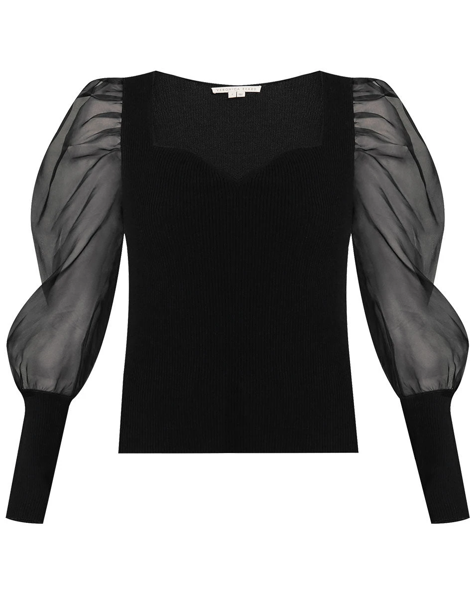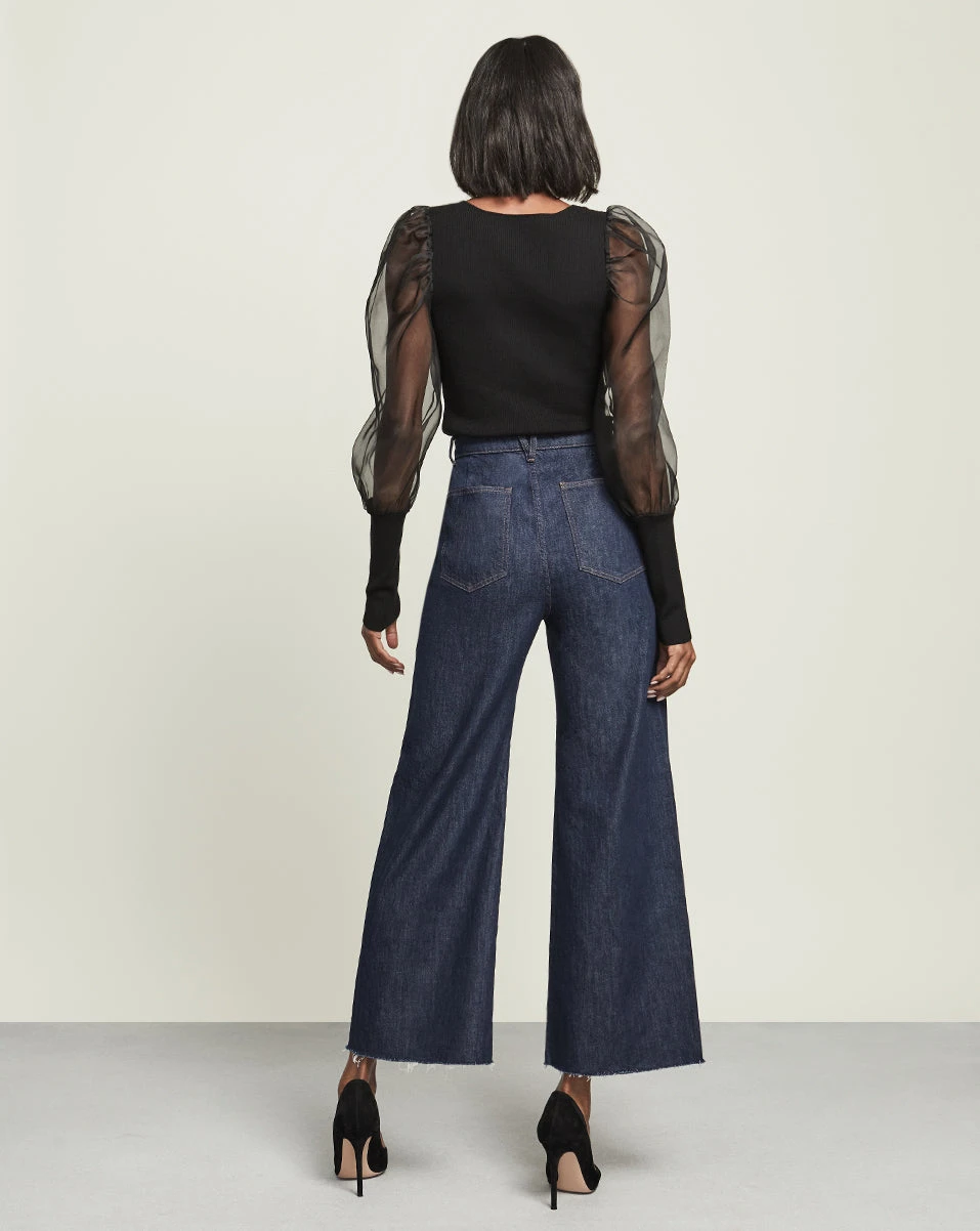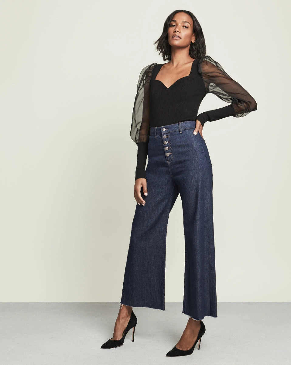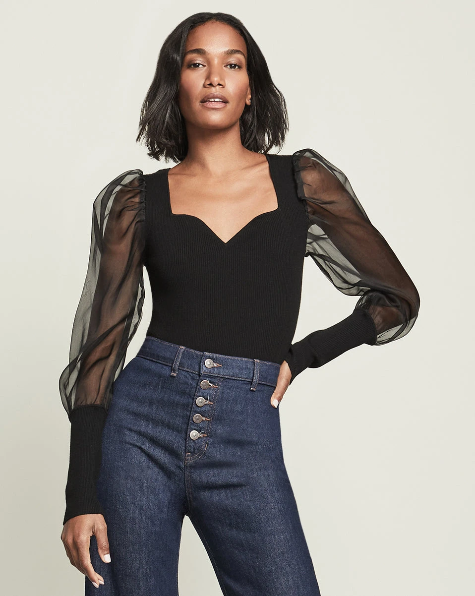 The Finian is the perfect going-out top with a merino wool shell and sheer puffed sleeves. A sweetheart neckline completes the look of this romantic yet edgy piece. Style with high-rise jeans and pumps for your next date night.