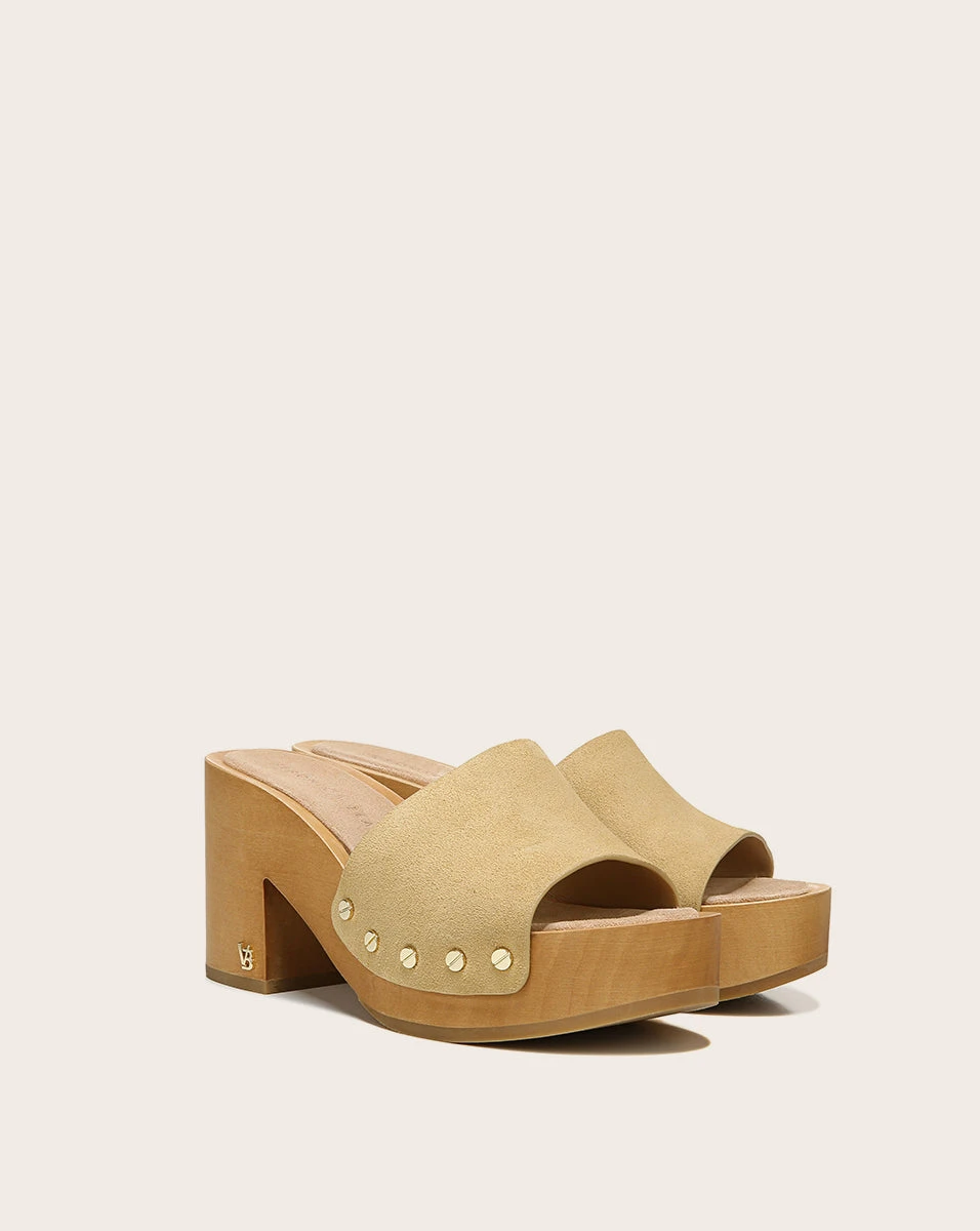Our Hannalee clog sandals feature a suede vamp with a studded trim, along with a wooden block heel. Wear this retro-inspired style with everything from miniskirts to tailored pants.