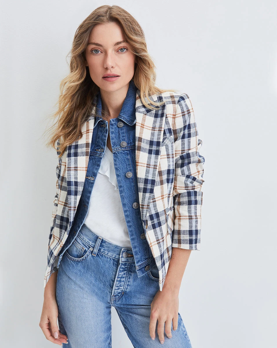 In our bold stretch plaid, the Hosanna jacket makes a statement, every time. Puffed shoulders complete the look of this single-breasted style. Wear with its coordinating shorts for a matching-set moment, or try it with distressed jeans for a chic, downtown look.