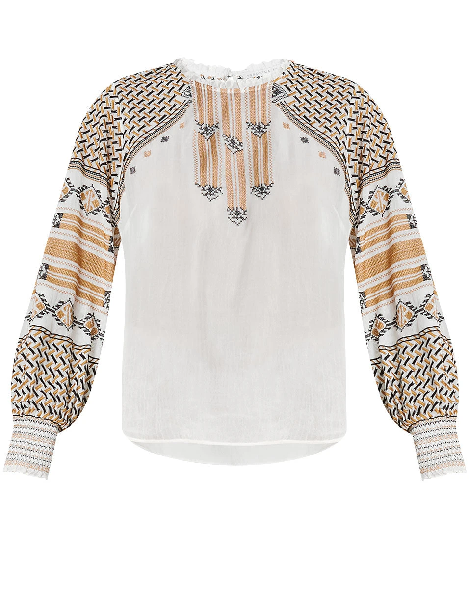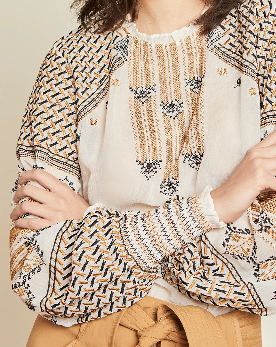 In our lightweight viscose, the Isabella top features intricate embroidery and a relaxed fit. Smocked cuffs complete the look of this long-sleeved must have. Tuck into high-rise jeans or shorts and finish with strappy flats for effortless ease.