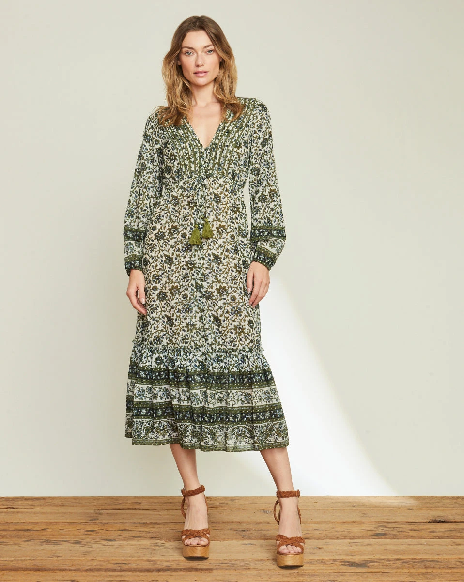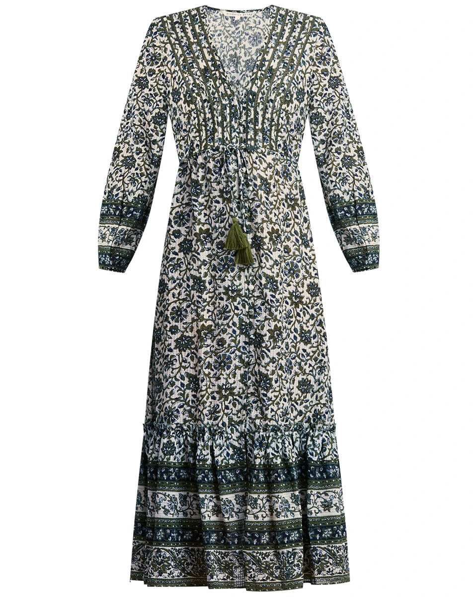 Perfect for wearing over your favorite swimwear, the Kameya maxi in a viscose-cotton blend is the lightweight dress you need. A deep V-neckline, elasticized waist, and tassel detailing give this floral-printed style its bohemian look.