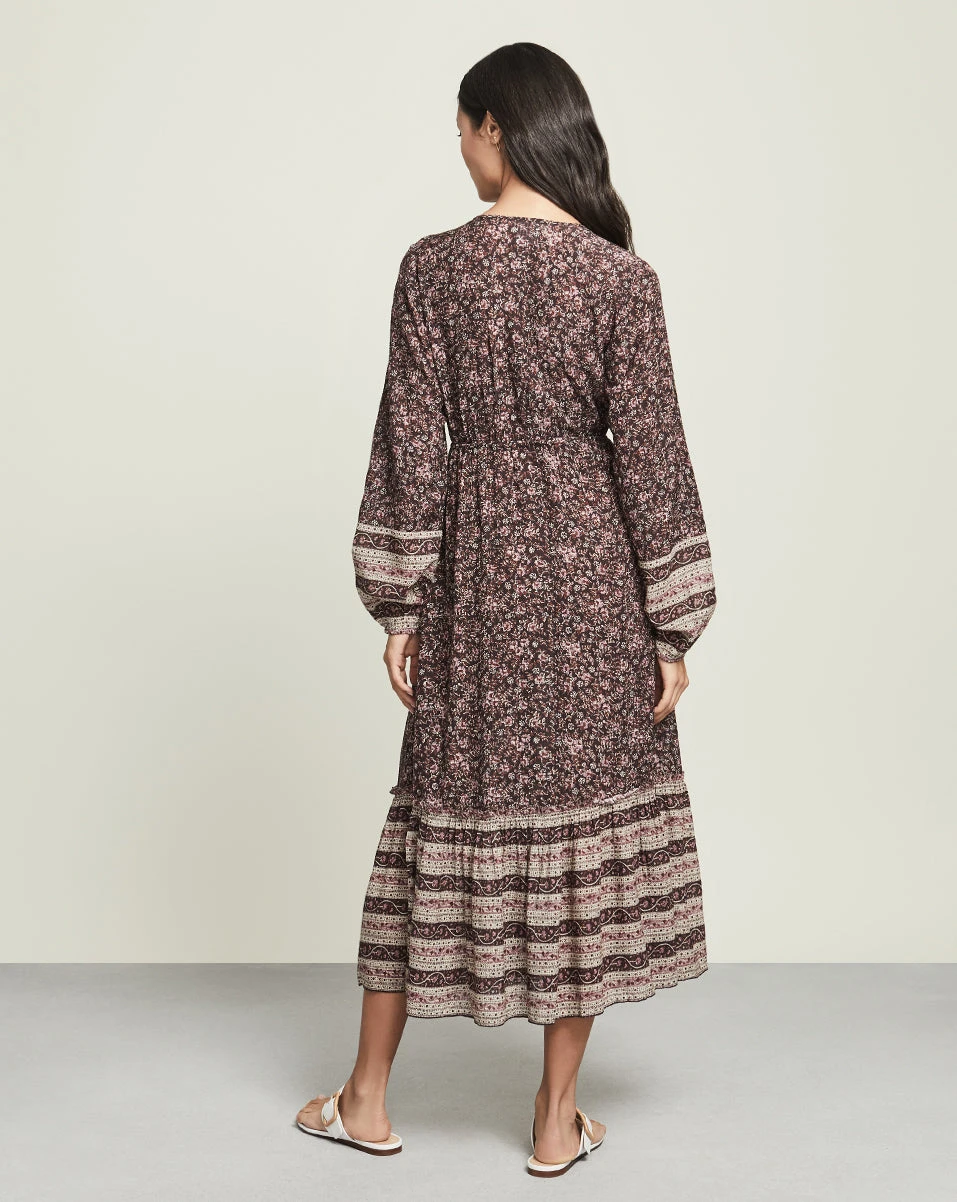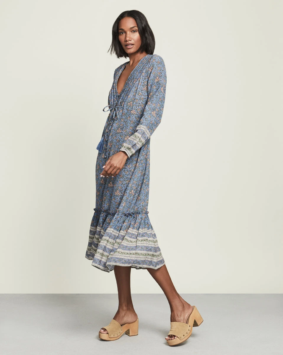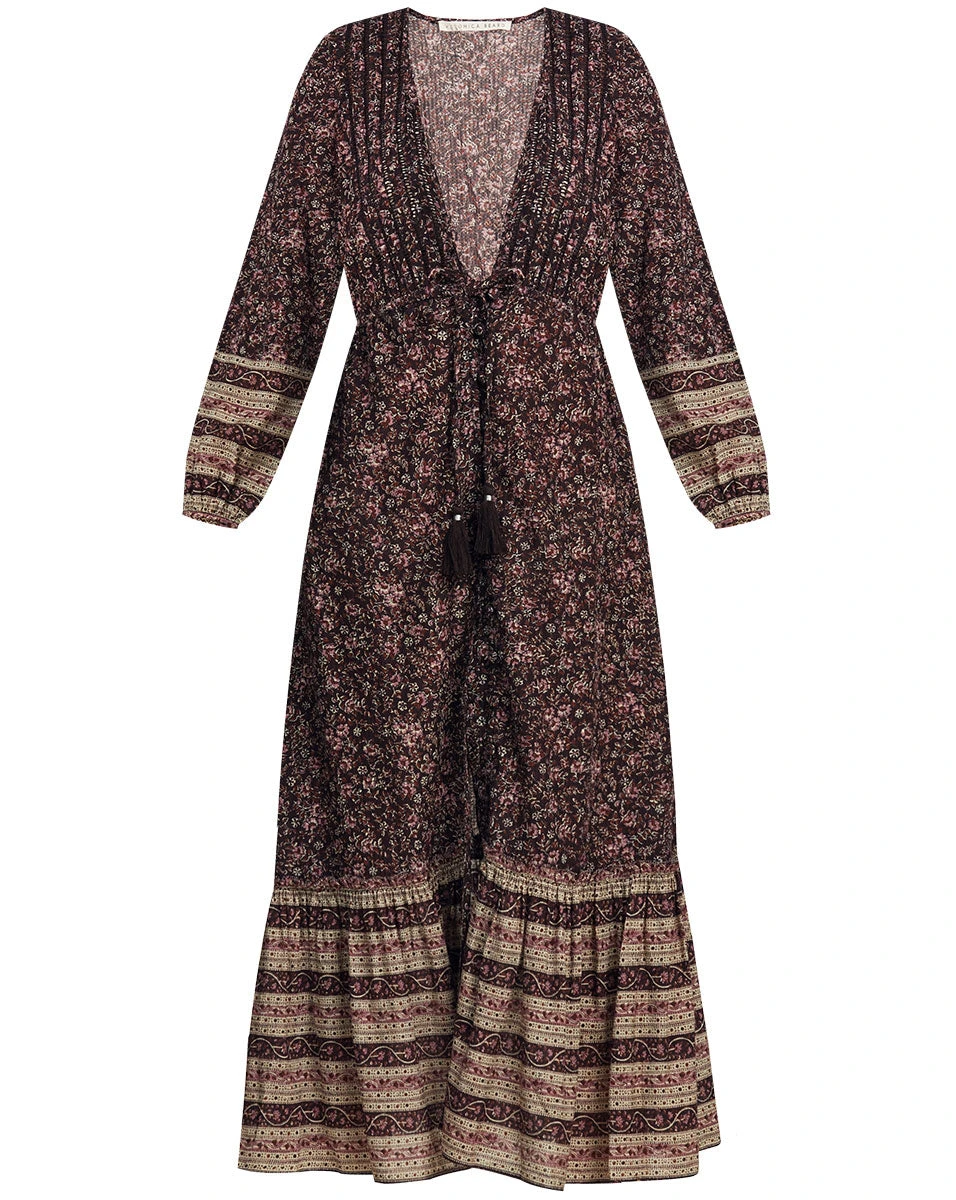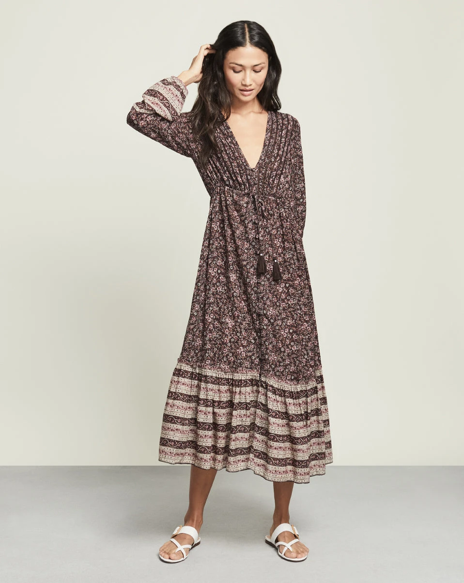 Perfect for wearing over your favorite swimwear, the Kameya maxi in a viscose-cotton blend is the lightweight dress you need. A deep V-neckline, elasticized waist, and tassel detailing give this floral-printed style its bohemian look.