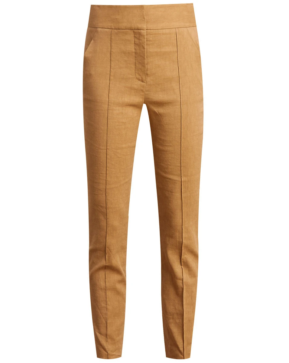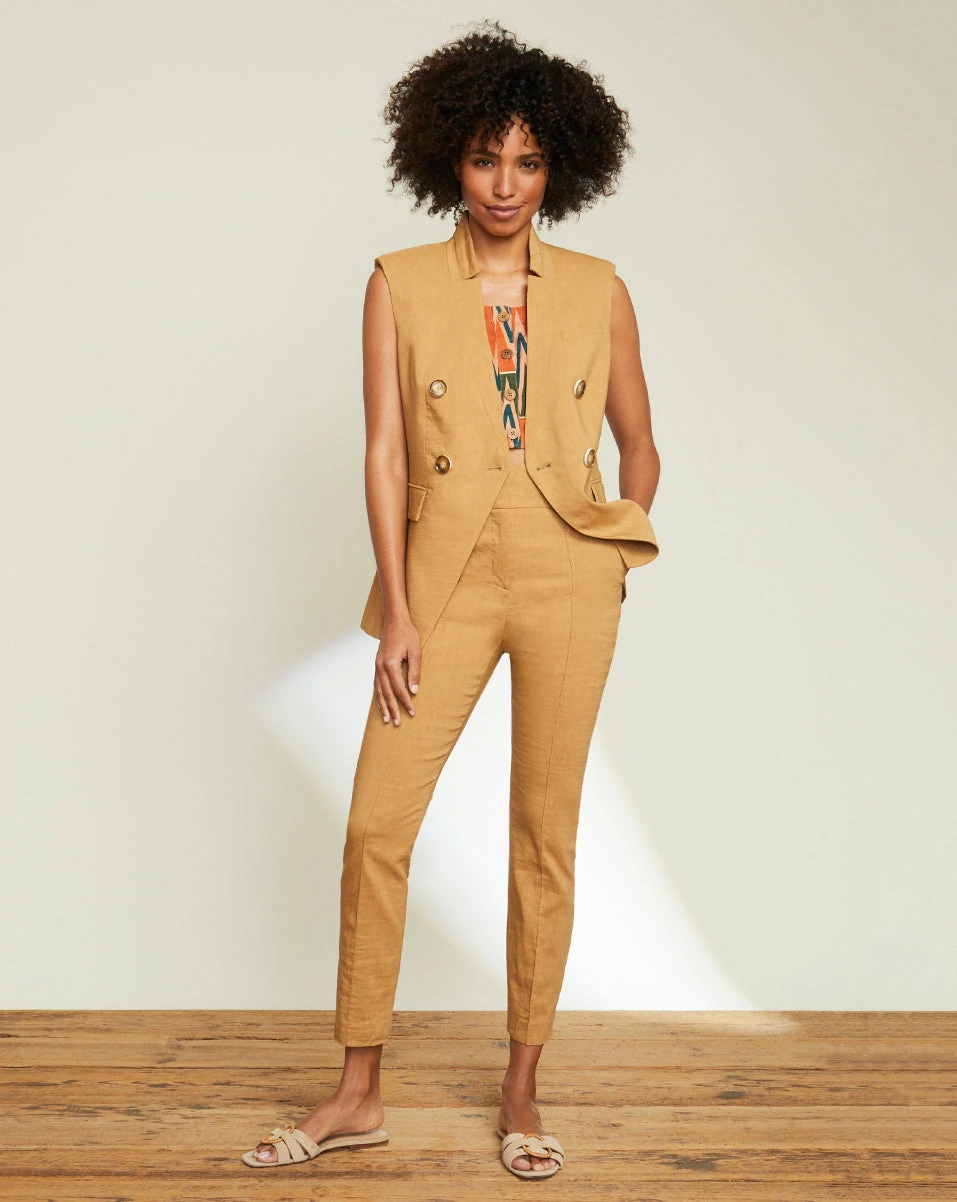 Our linen-blend Lago pant showcases a figure-flattering silhouette with elongating front seams, making it a timeless essential you’ll reach for again and again. Pair this style back to its coordinating jacket and a statement top.