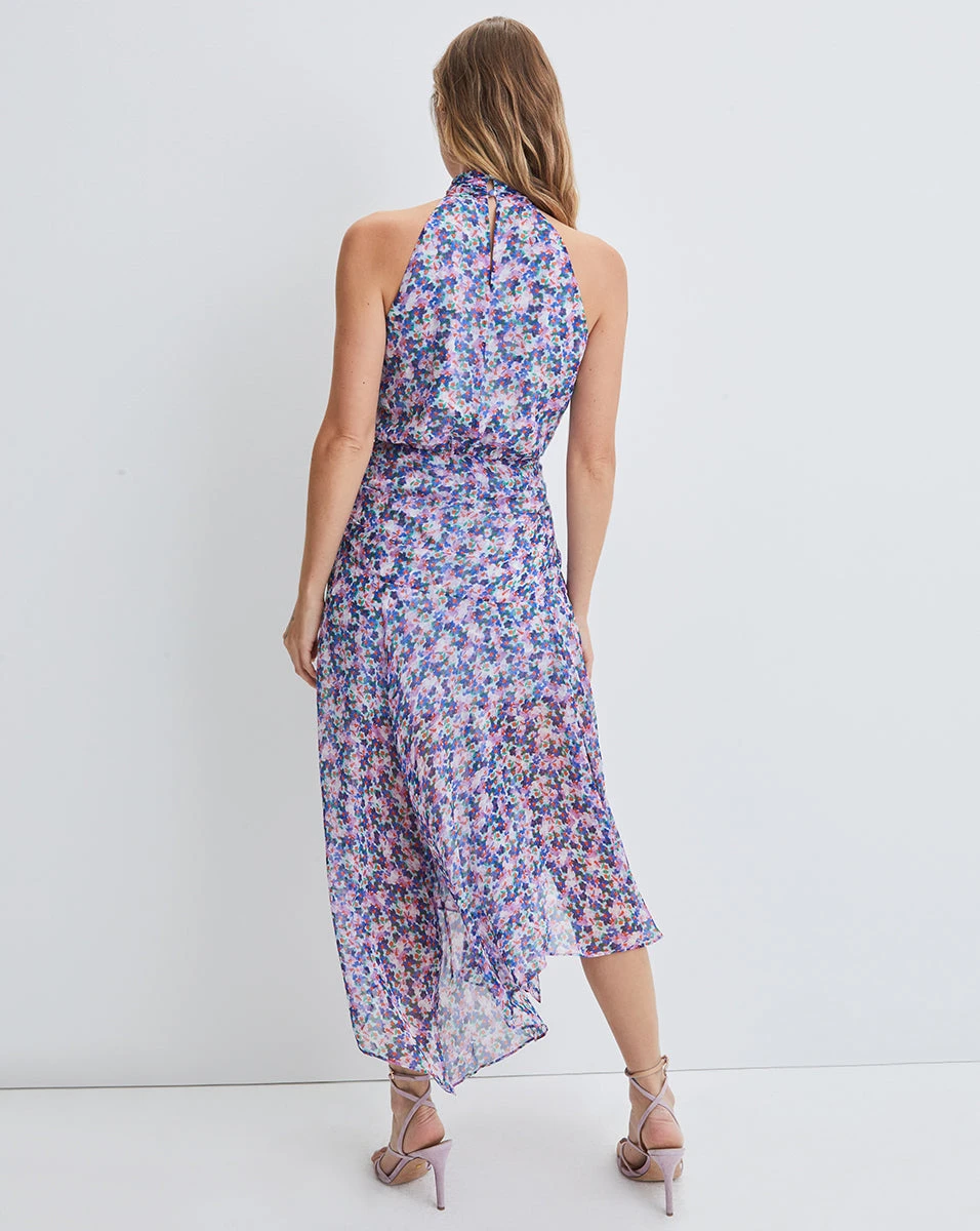 In our colorful abstract print, the Leia makes a bold yet playful statement. The halter neckline and semi-sheer handkerchief skirt complete the look of this going-out style. Wear with strappy stiletto sandals and polished gold jewelry for your next event.