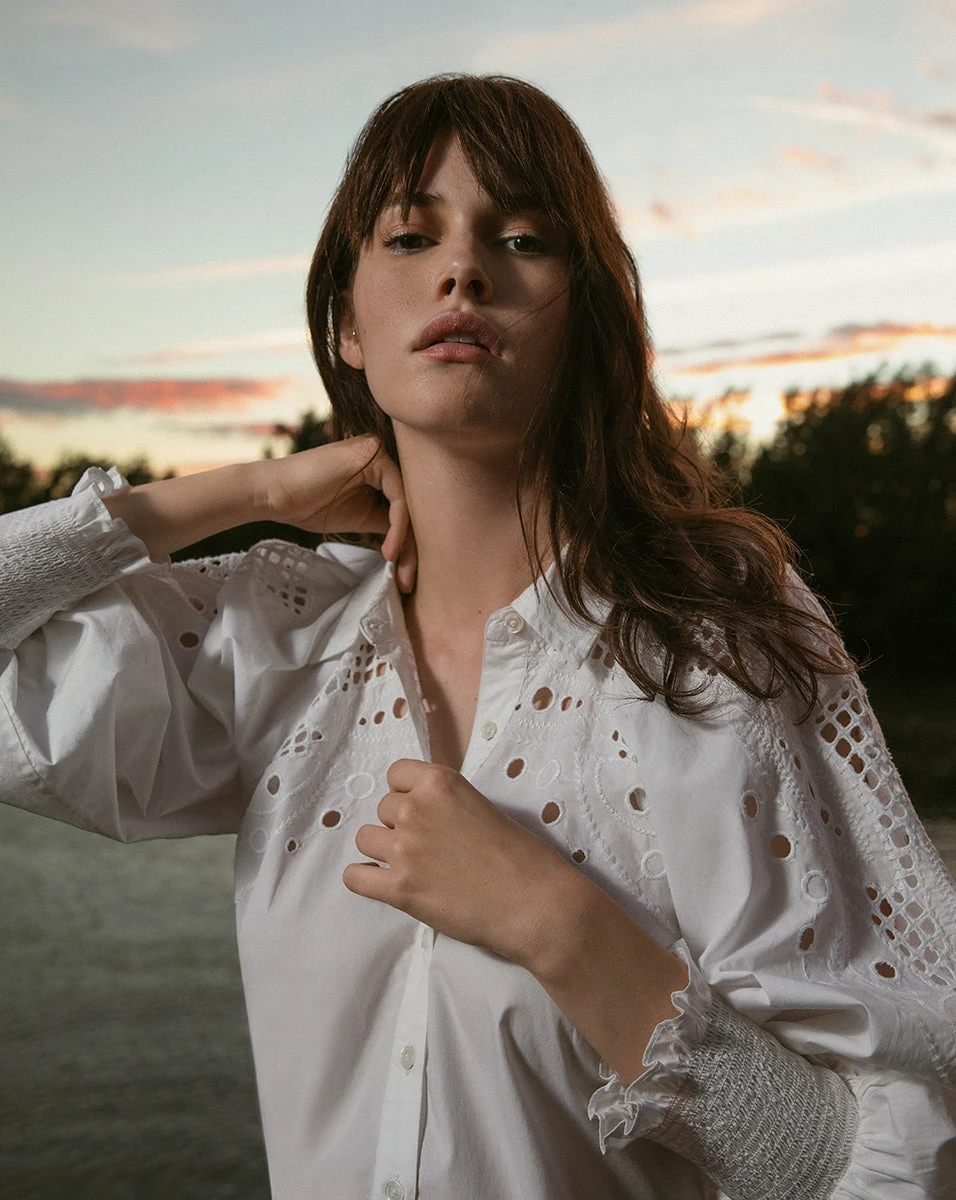 The Lilah top is your classic white button-down, reimagined. With placement eyelet and smocked cuffs, this ultra feminine style will quickly become one of your everyday go-tos. Wear with high-rise trousers for workwear chic, or dress it down with cropped denim and sneakers.