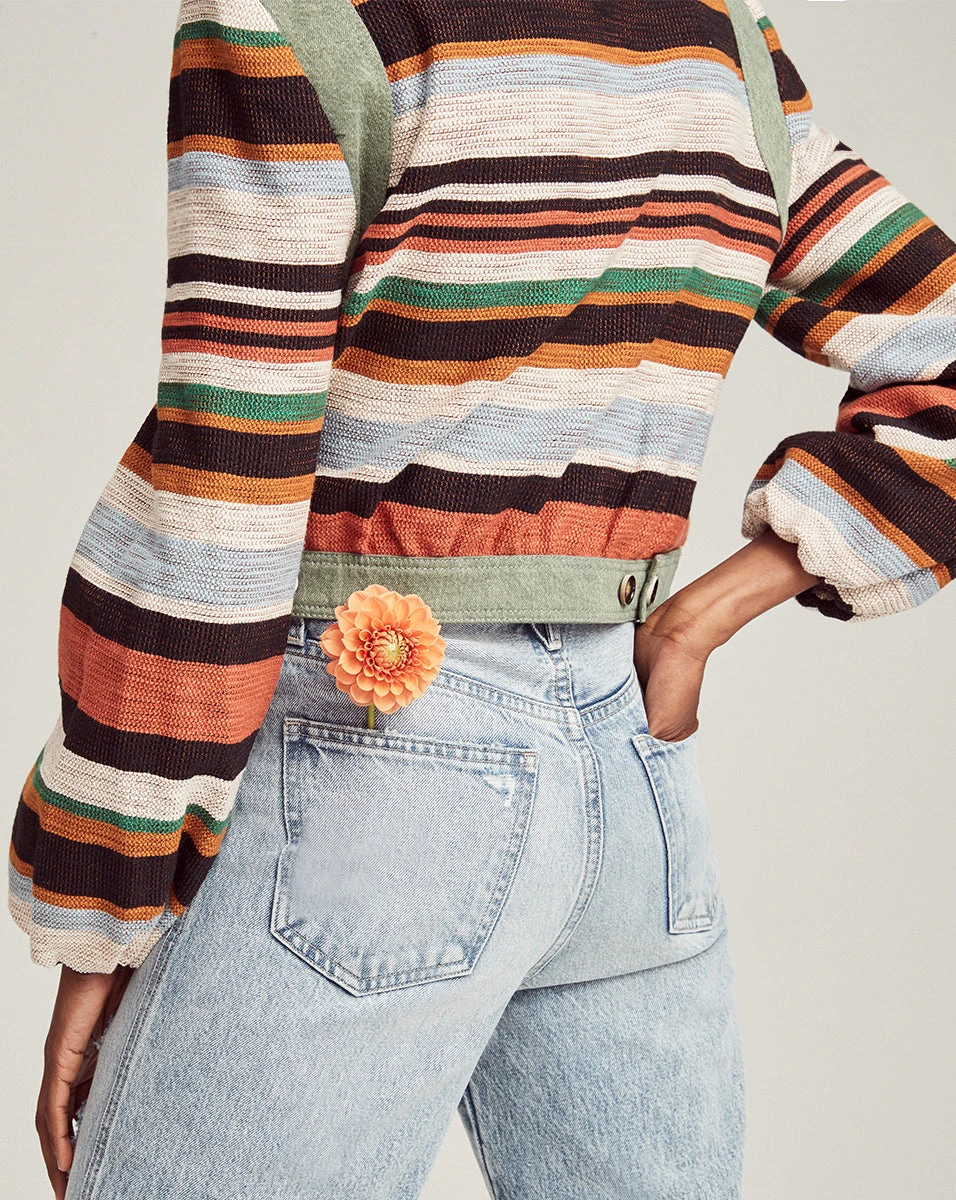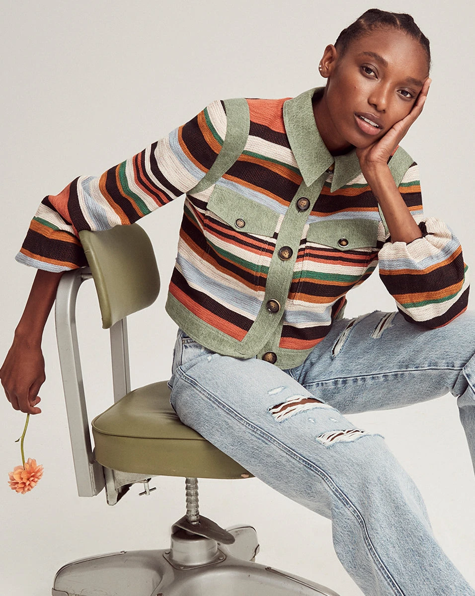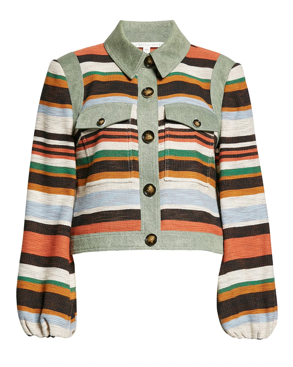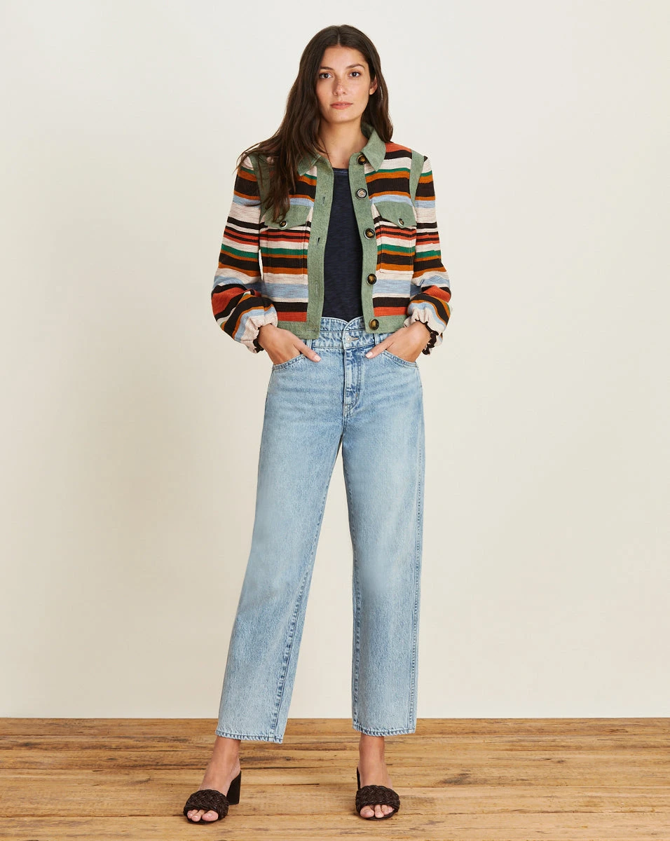 The Lorelei jacket is our statement jacket for spring, thanks to its stripe box-weave body and contrast piping. A cropped length and earth-tone hues complete the look of this must-have style. Wear with high-rise pants and your favorite heels for a head-turning look that remains effortless.