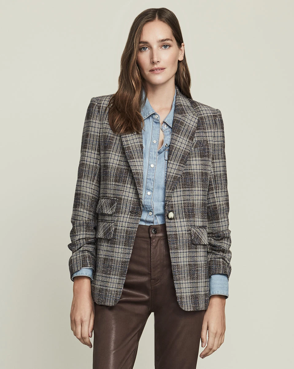 Our Martel jacket in brown plaid offers an oversized fit and on-trend ruched sleeves. In a cotton-linen blend, this classic and chic style pairs perfectly with relaxed dresses or jeans and will quickly become your next go-to piece.