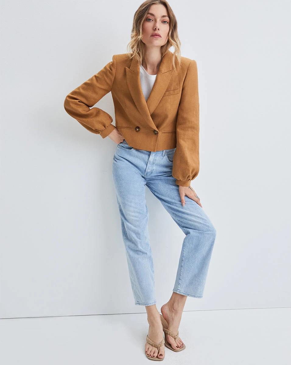 In our basketweave linen, the Milani is a reimagined, feminine take on the classic linen jacket. Puffed sleeves, a cropped length, and a single-button closure complete the look of this key seasonal item. Wear it with anything and everything—we especially love it over our favorite dresses.