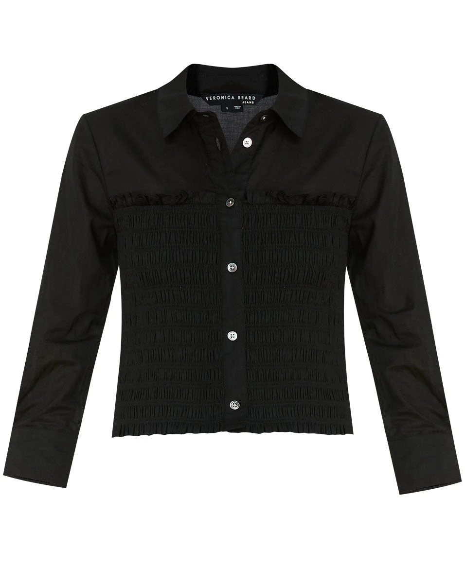 In our washed cotton voile, the Emersyn shirt features a smocked front complete with buttons. A cropped hem finishes the look of this casual yet elevated style. Wear with high-rise jeans and strappy sandals for your next girls’ night out.