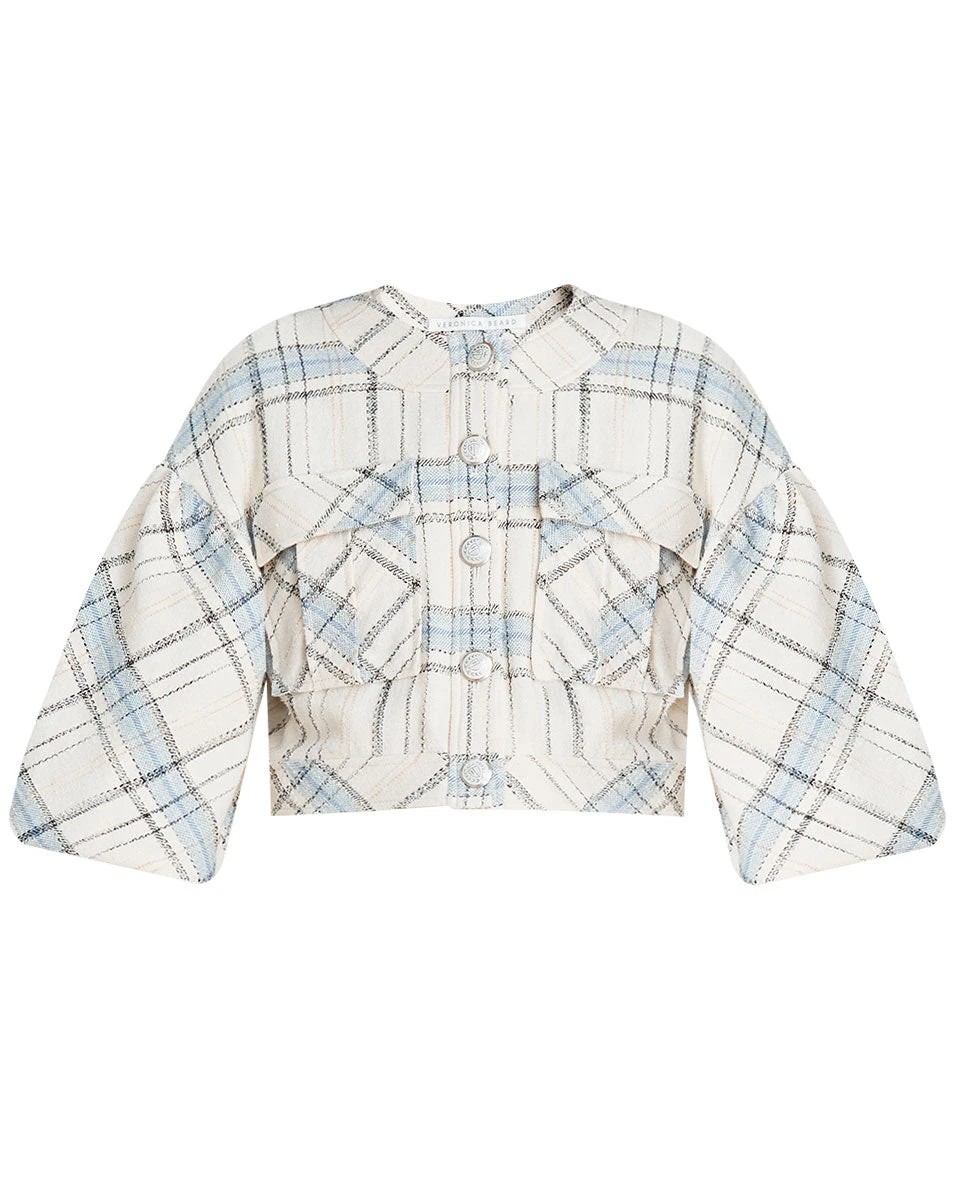 Voluminous bell sleeves and oversized plaid give our Nikolai jacket its distinctive look. Front patch pockets and metal crest buttons complete the look of this chic style. Wear with high-rise trousers and loafers for uptown cool.