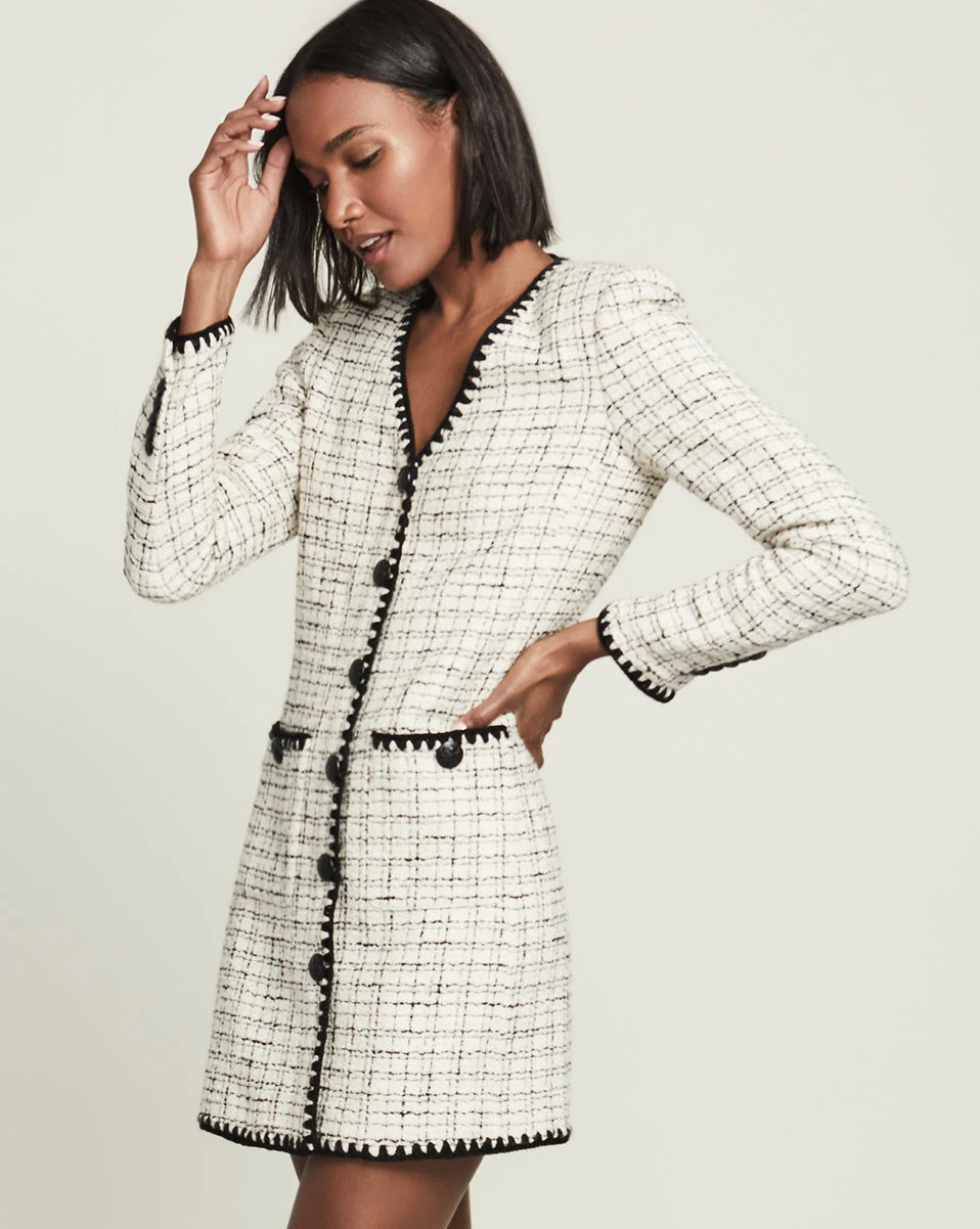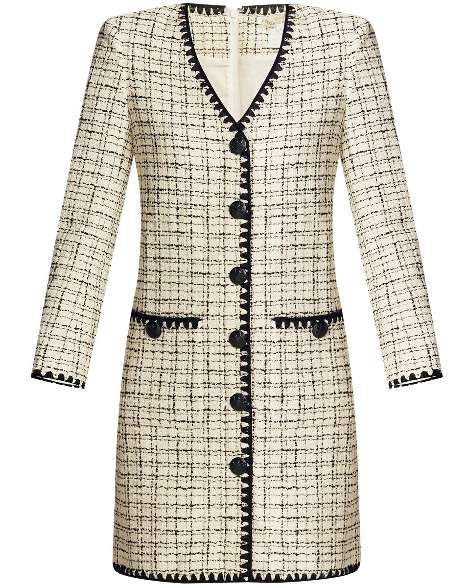 A tweed dress done right—meet the Palatine. This classic-meets-cool style features decorative crest buttons and embroidery, along with an easy and flattering shift dress silhouette. Keep it chic by pairing with ankle booties, for an uptown-meets- downtown look.