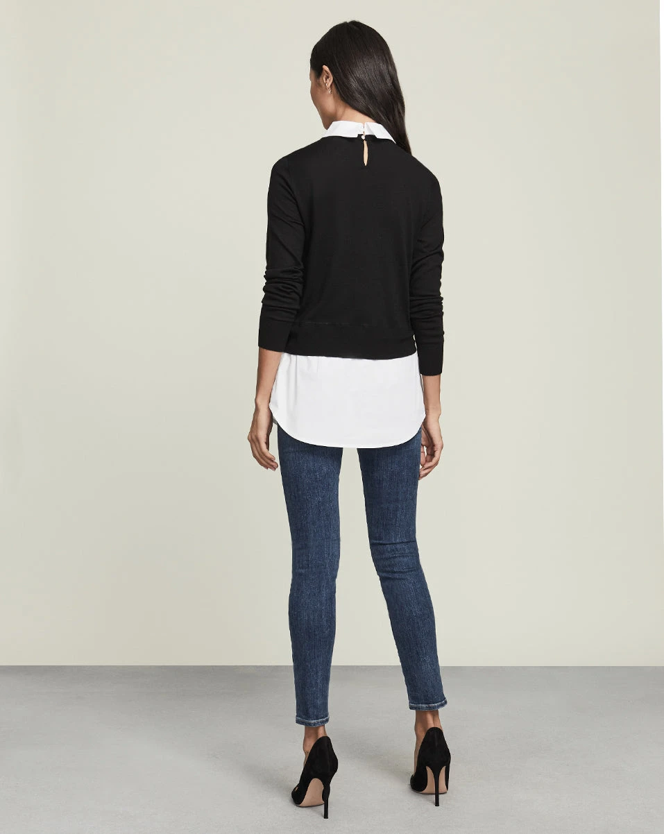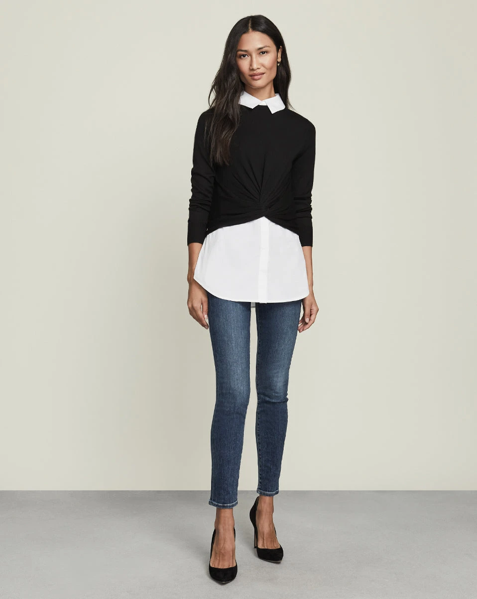 Our Phebe sweater is a mixed-media piece with a merino wool knit top and a poplin collar and hem. A twist accent at the front waist creates more stylish appeal. Wear the piece with sleek trousers and polished gold jewelry.