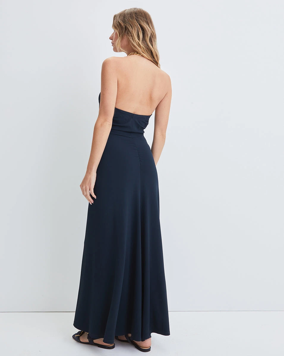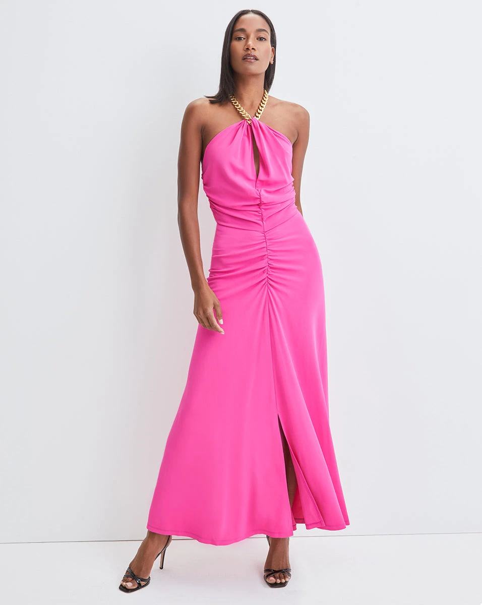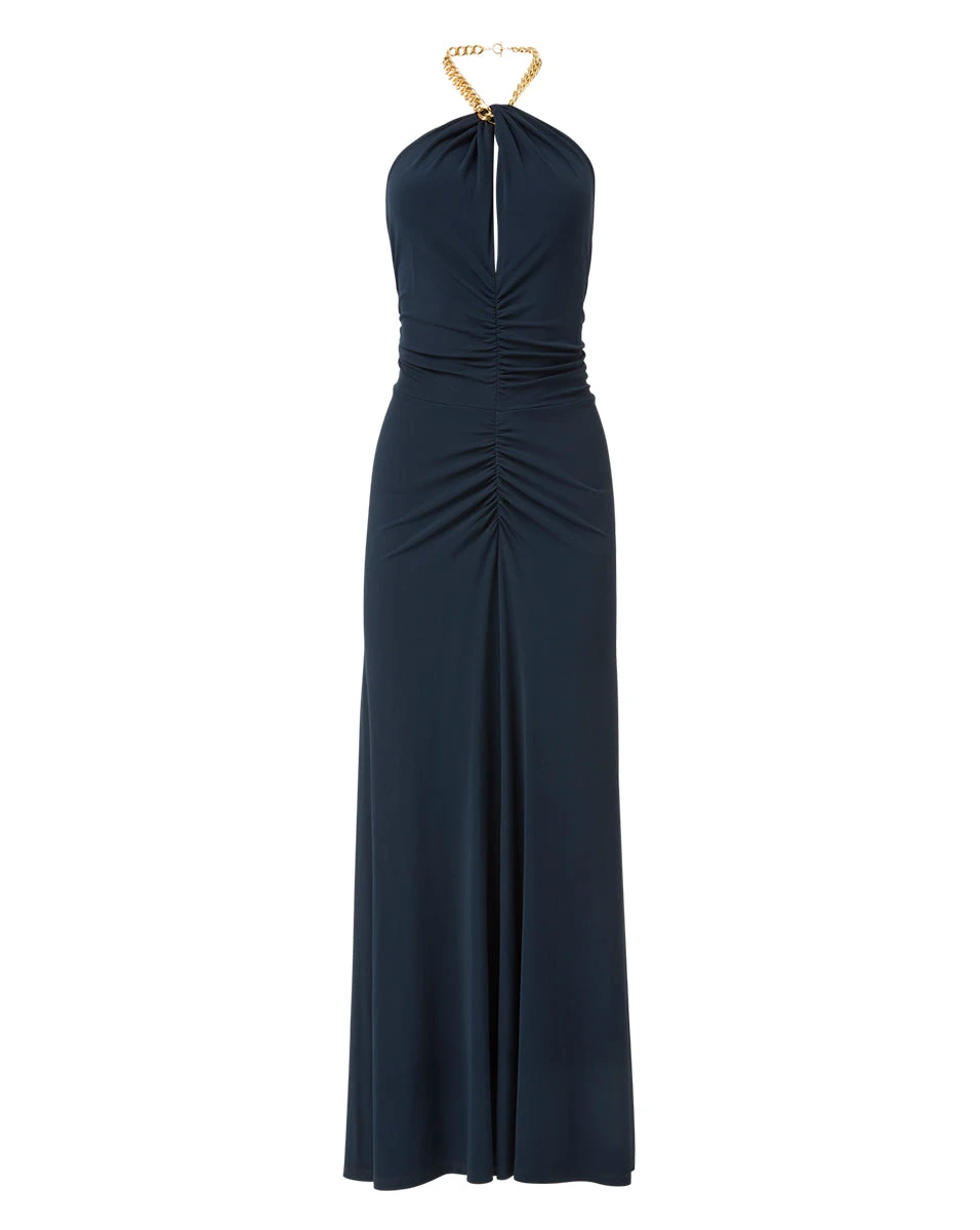 The Reze is a statement-maker, thanks to its sleek matte-jersey fabric and halter neckline—complete with a gold chain-link strap. Ruching at the center provides a figure-flattering finish. Wear with gold stiletto heels to your next event—it’ll be a look no one forgets.