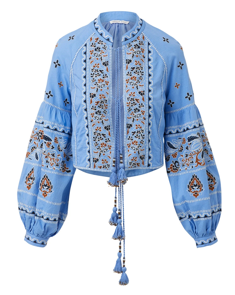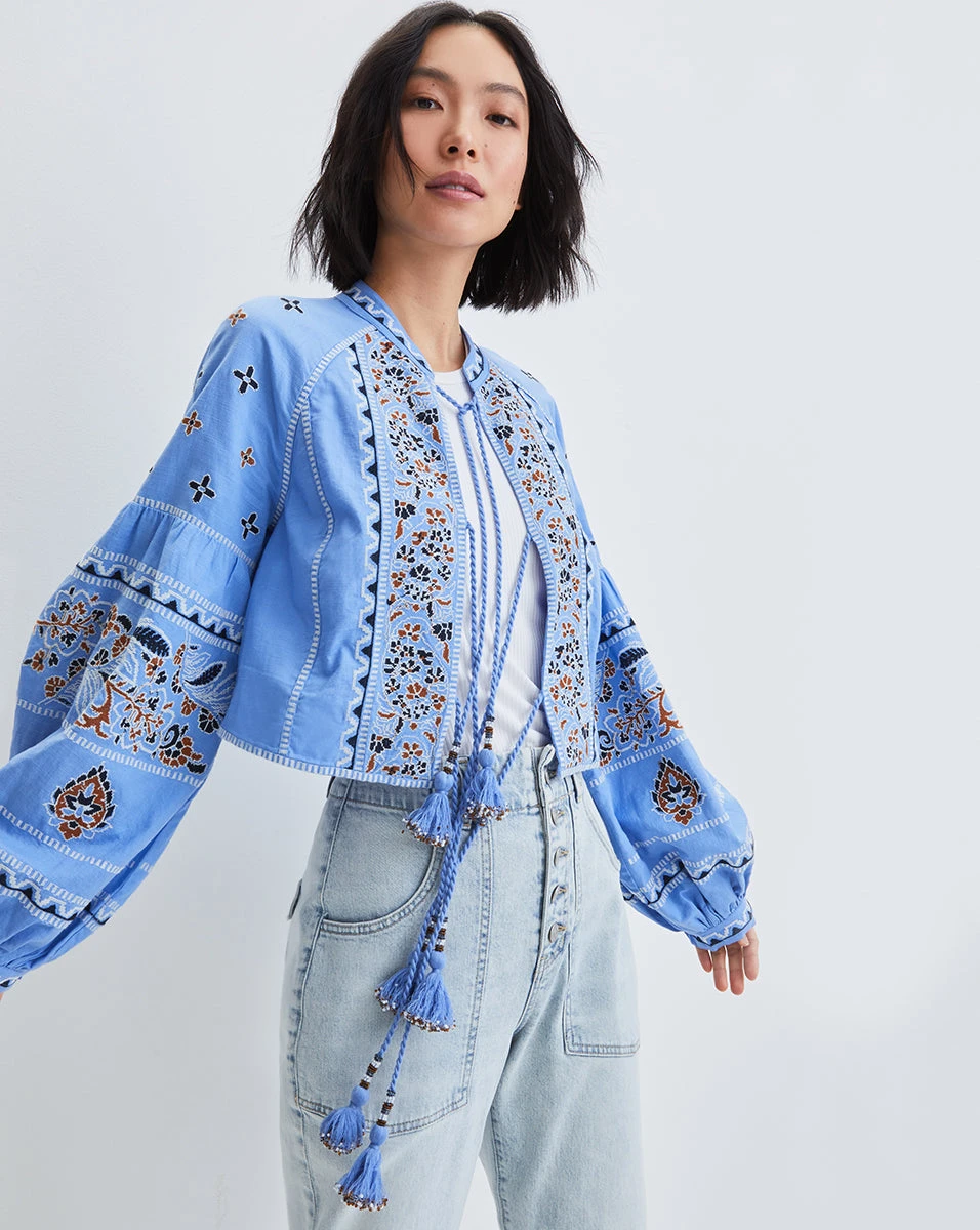 In our lightweight linen and cotton blend, the Rivoli is the summer jacket you need. Allover embellishment, poet sleeves, and long tassels give this piece its bohemian style. Wear with jeans and a tee to instantly elevate your look.