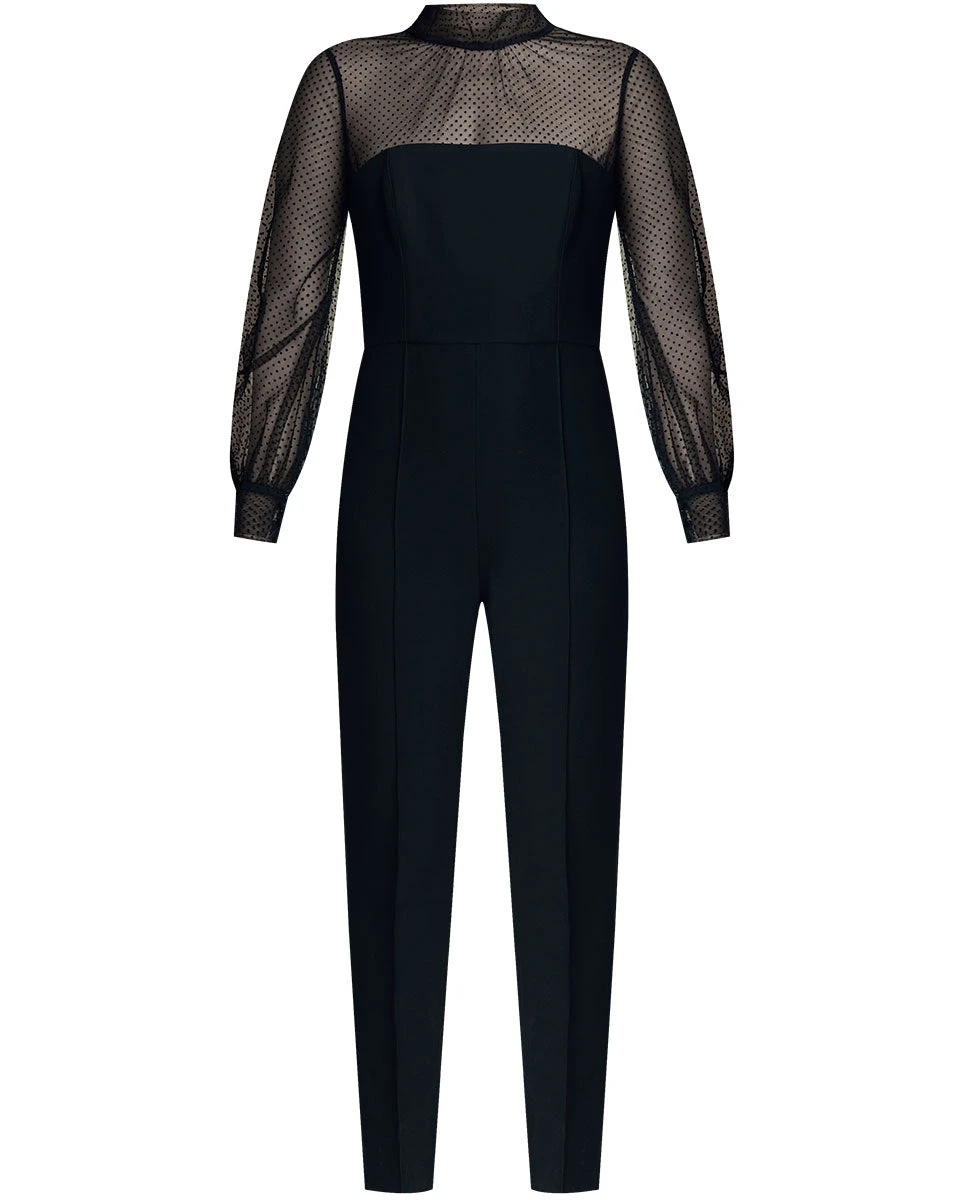 For an easy night-out outfit, look to the one-and-done Saluja jumpsuit. This flattering and chic style features a sheer Swiss dot yoke and puffed sleeves. Ties at the back neck complete the look of this romantic-meets-edgy piece. Pair with stilettos, polished gold jewelry, and a bold red lip.