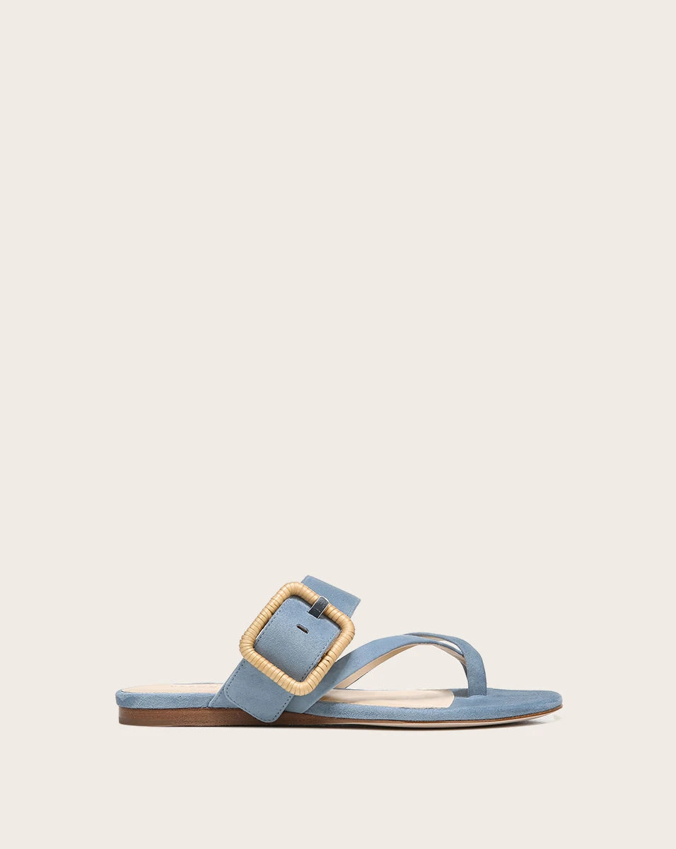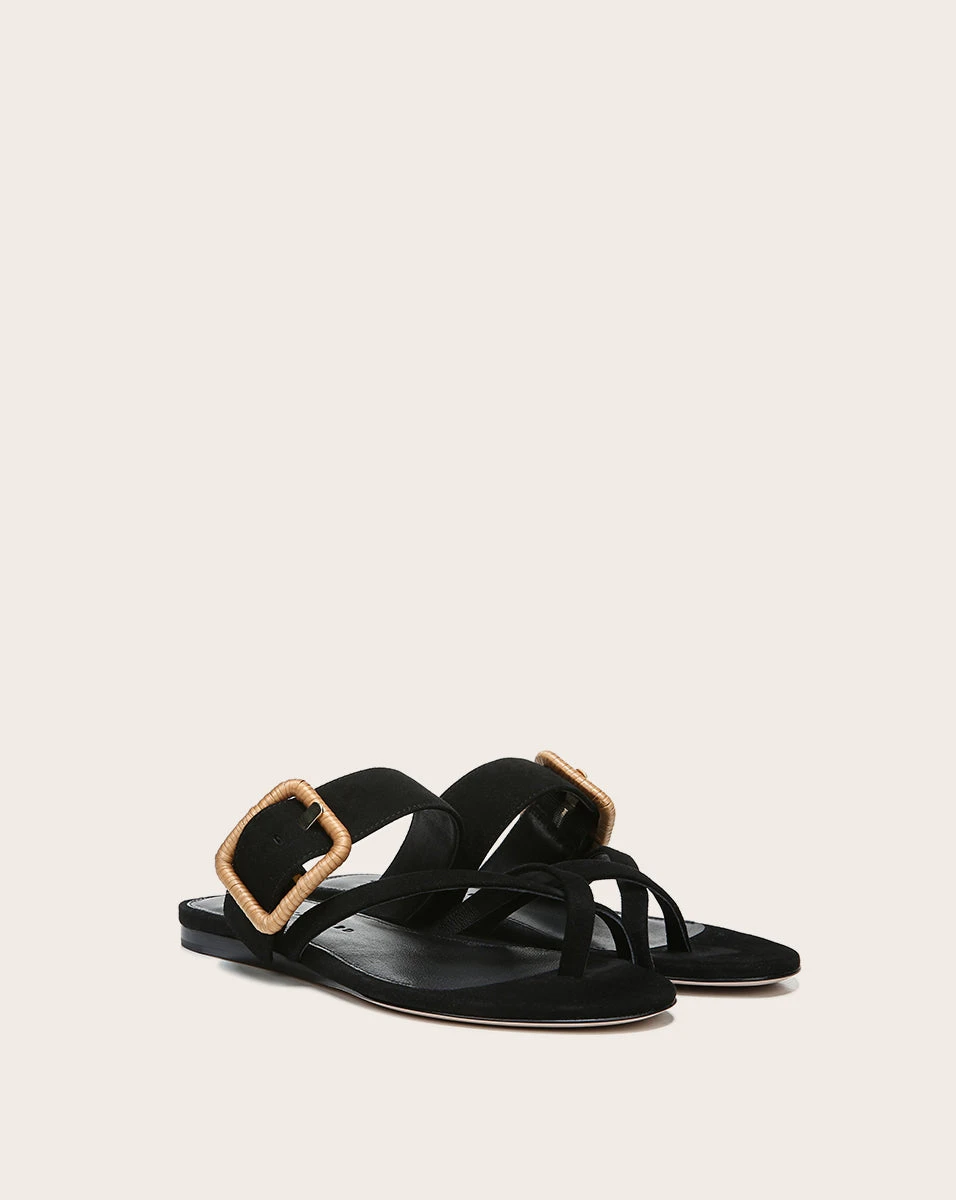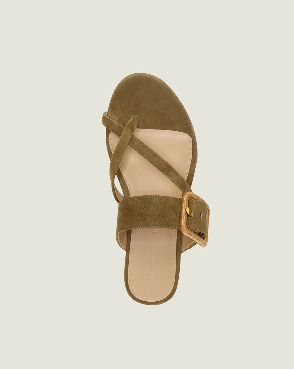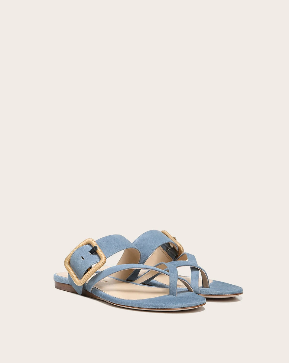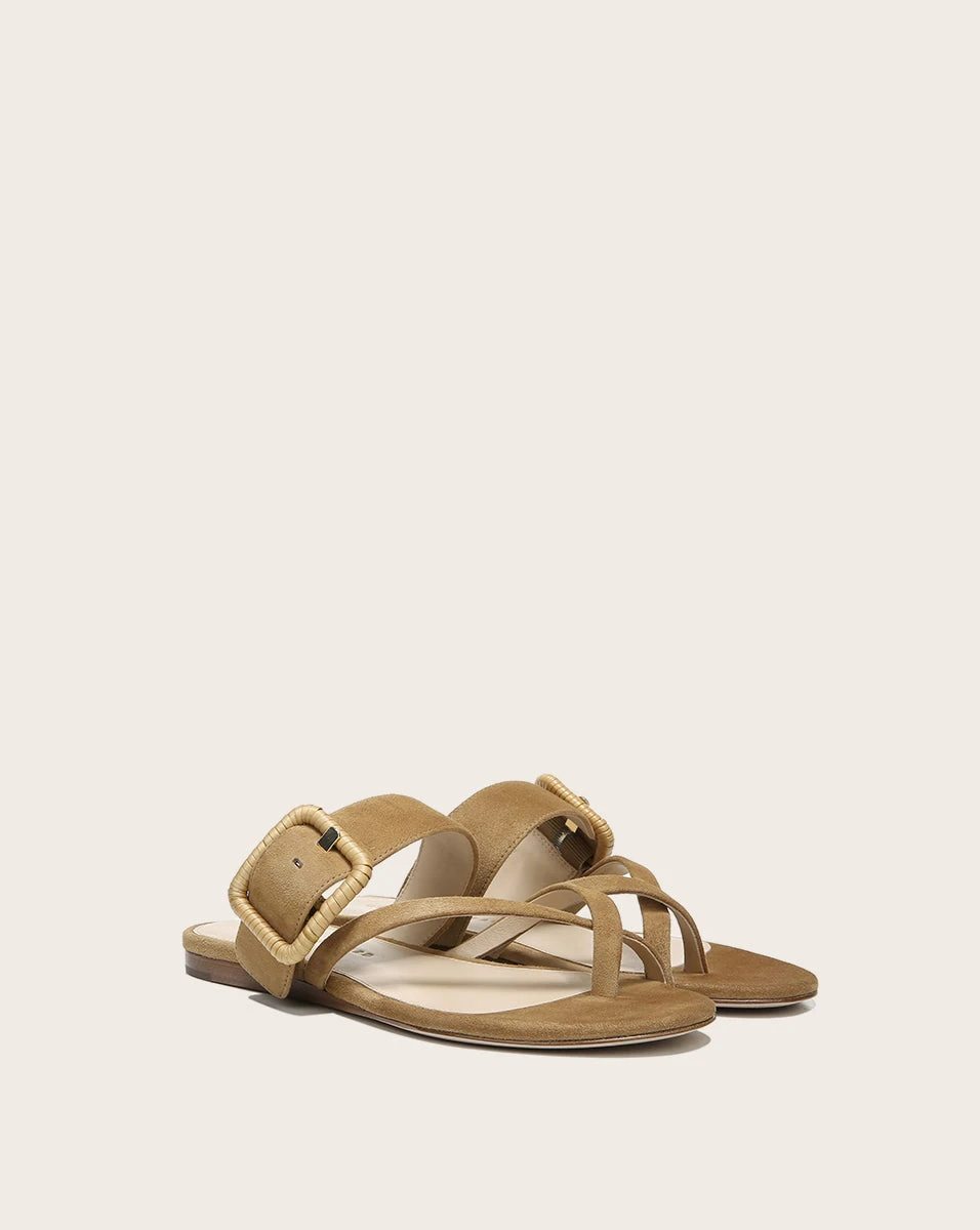 The Salva in luxe suede is a chic take on summer sandals, complete with an oversized raffia buckle at its vamp. A crisscross toe strap and a stacked flat heel make this style effortlessly cool with any look.