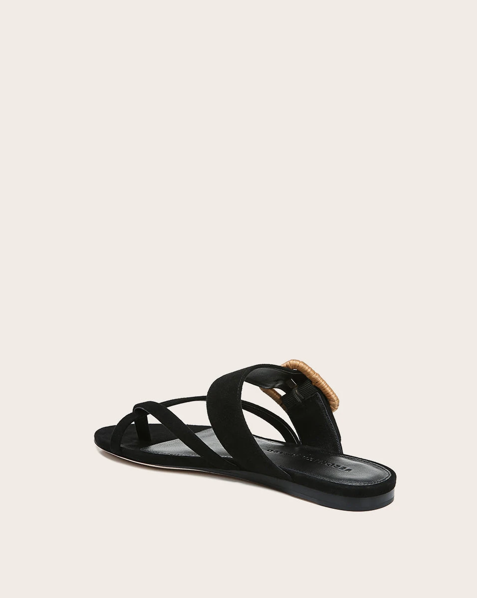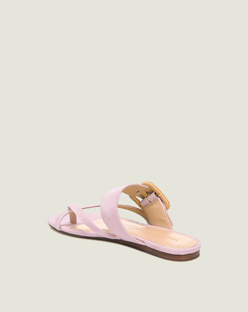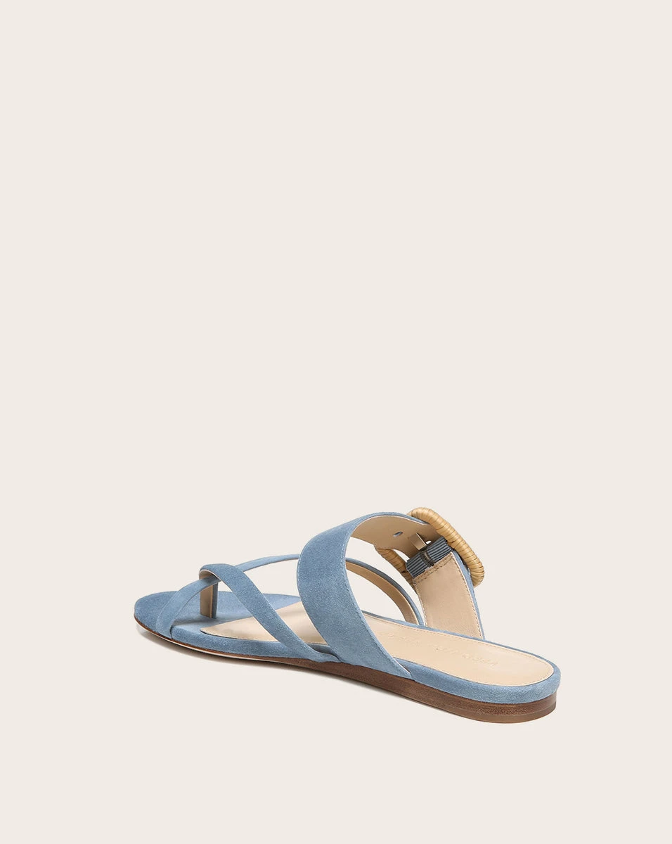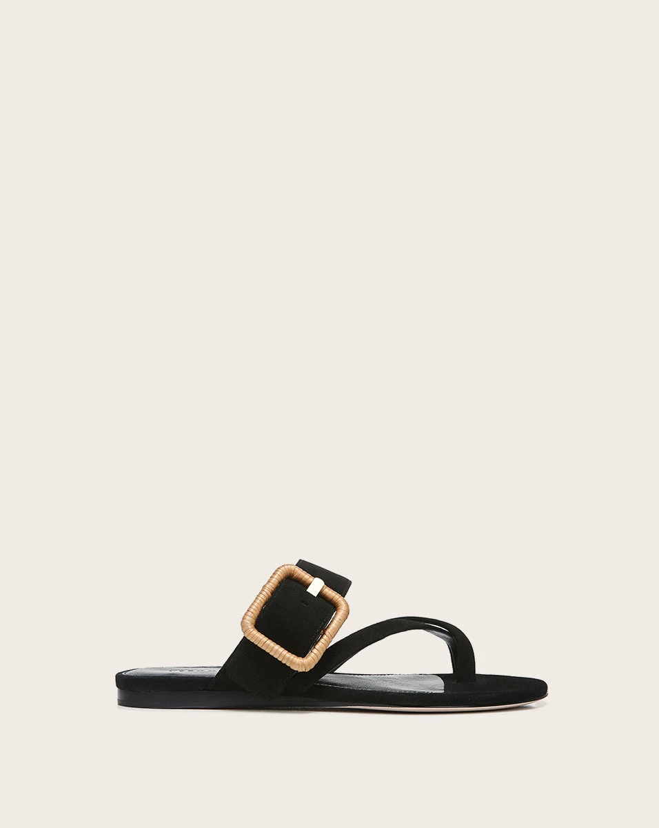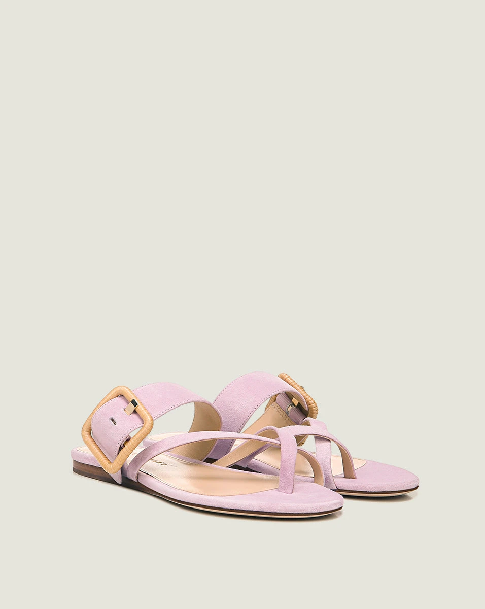 The Salva in luxe suede is a chic take on summer sandals, complete with an oversized raffia buckle at its vamp. A crisscross toe strap and a stacked flat heel make this style effortlessly cool with any look.