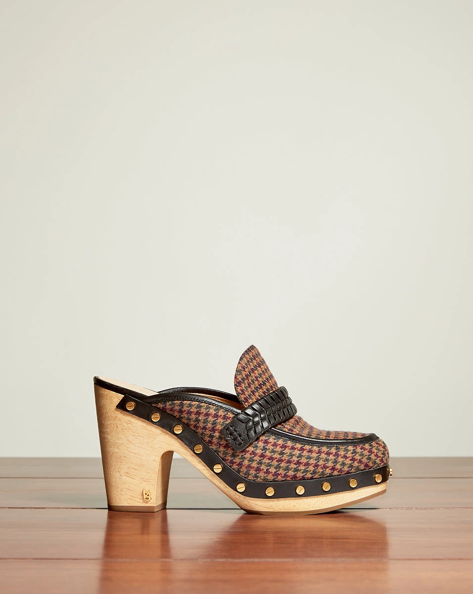 Our Delia clog heel features a leather upper along with a braided detail at the vamp. A studded trim completes this glamorous and fashion-forward style. Pair with just about anything to elevate your look.