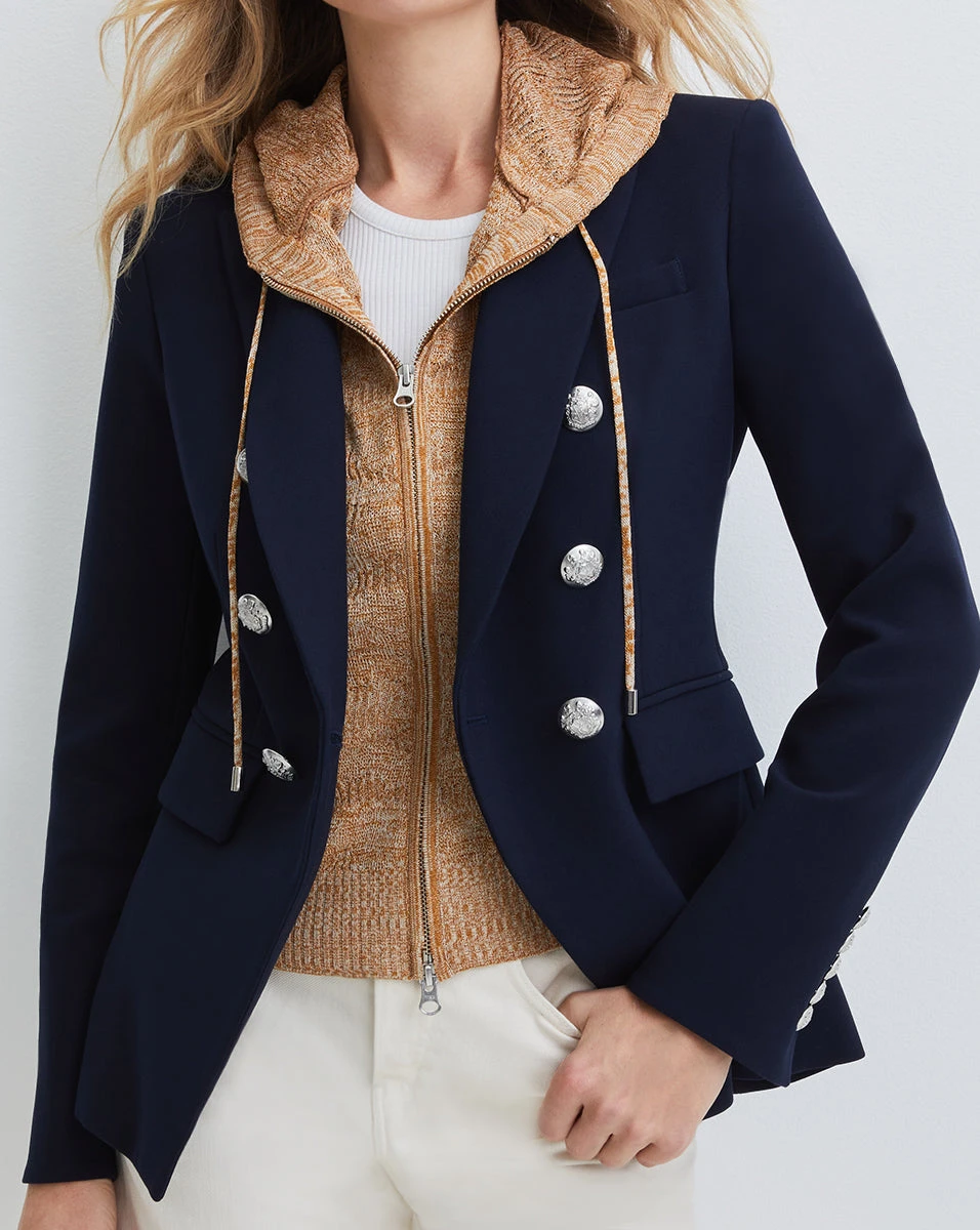 Our gold Souine dickey adds a glamorous underlayer to any of your dickey jackets. A hoodie gives a casual finish to this must-have style.